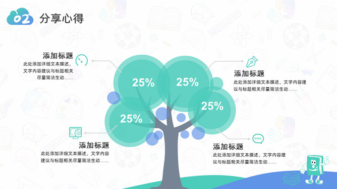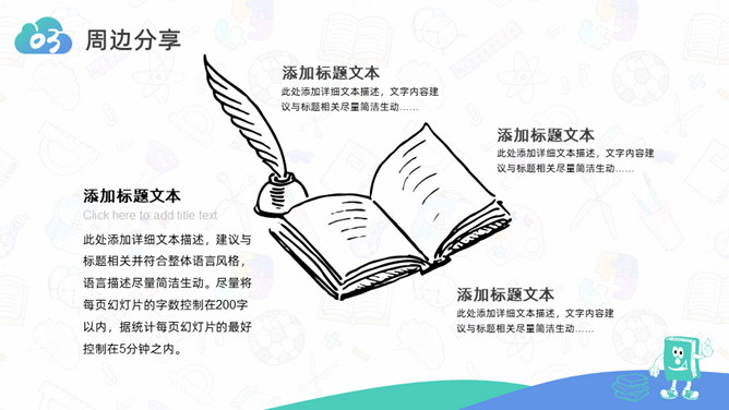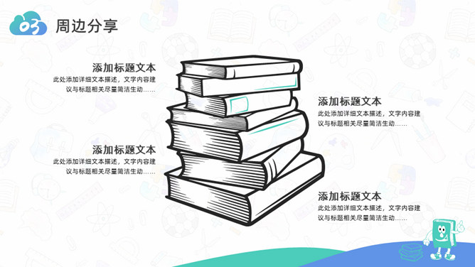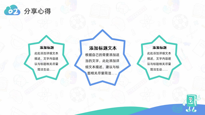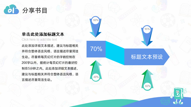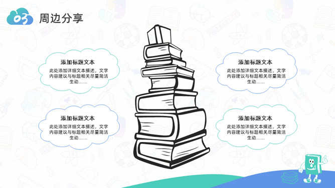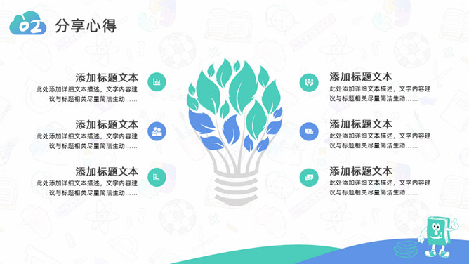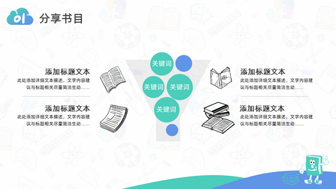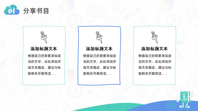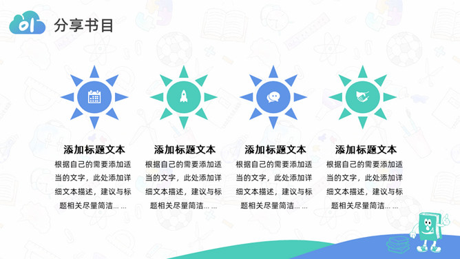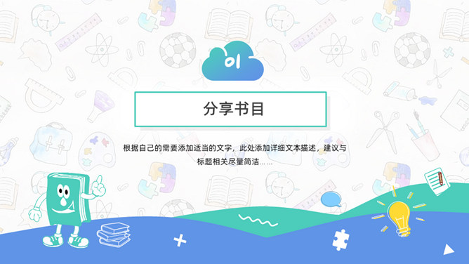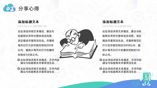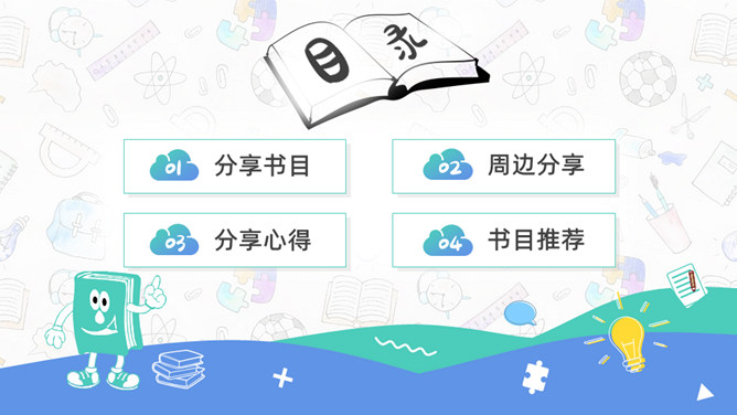 卡通小学生读书分享活动PPT模板。一套小学生读书分享会活动模板,可爱卡通设计,简约清新蓝绿配色。