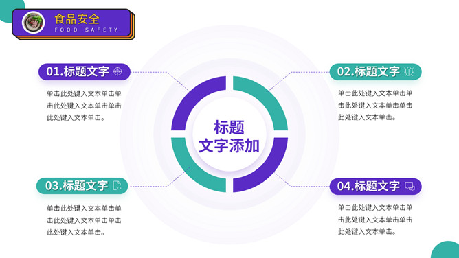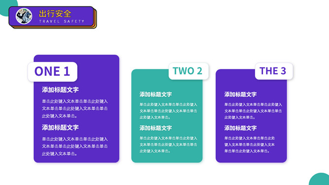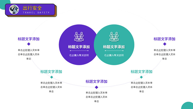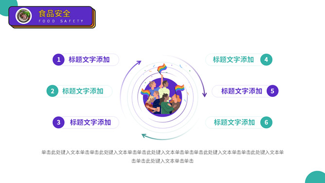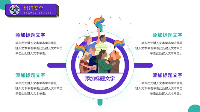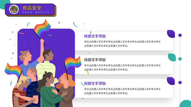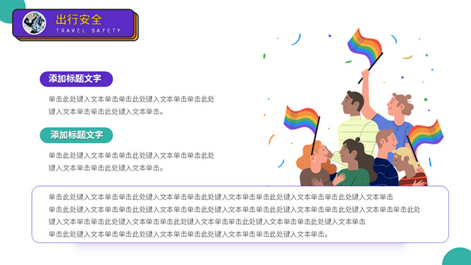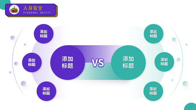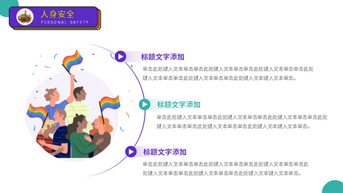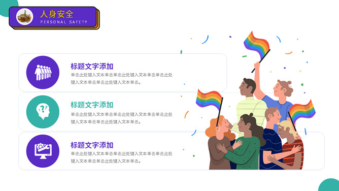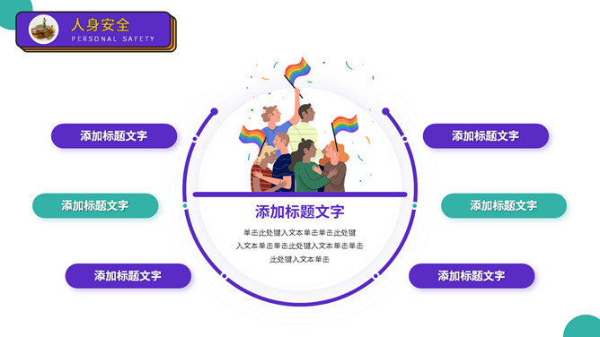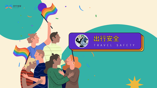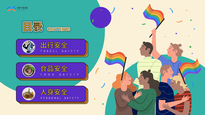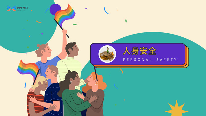 大学生人身安全教育主题班会PPT模板。扁平化矢量设计,活力彩色配色,包括出行安全、食品安全、人身安全等。
