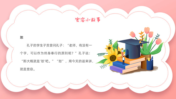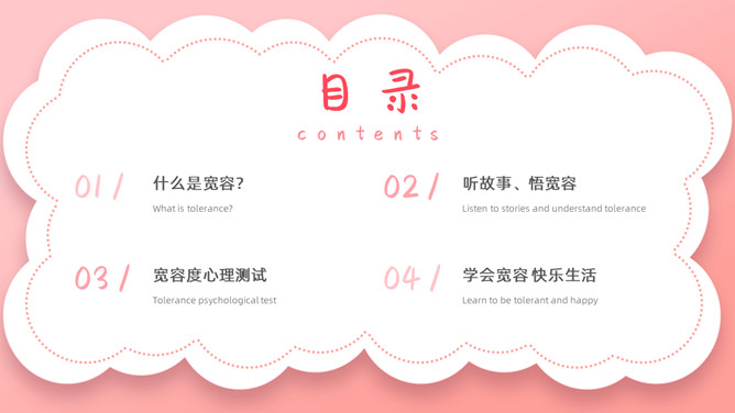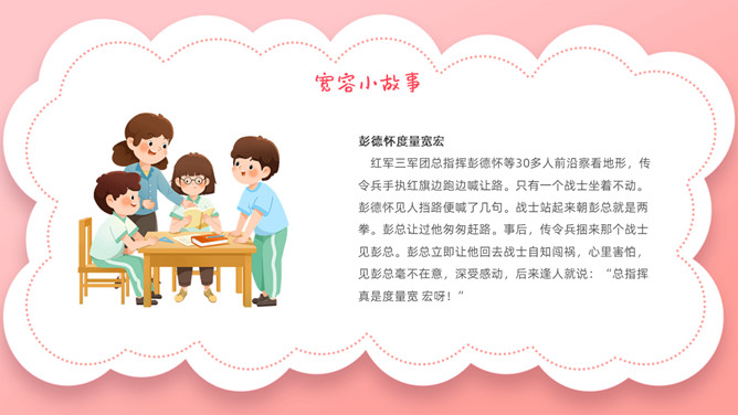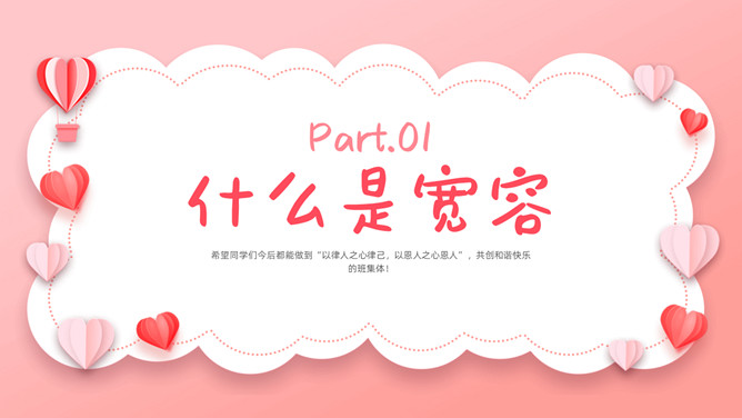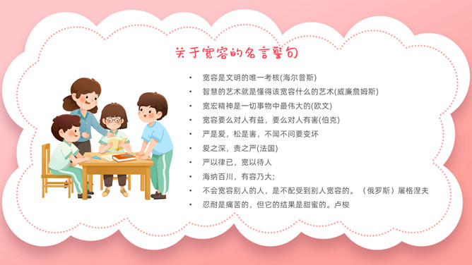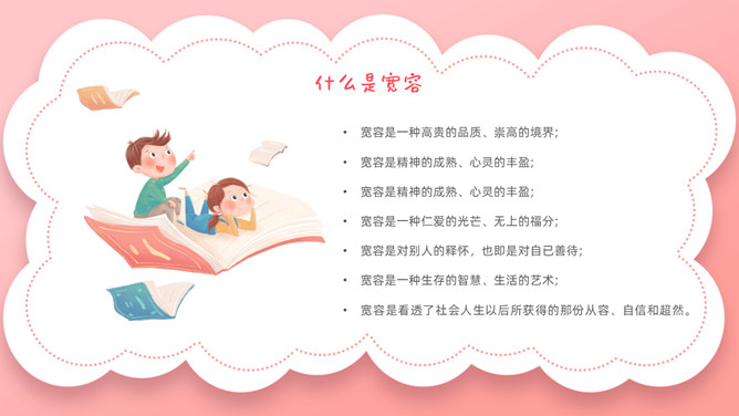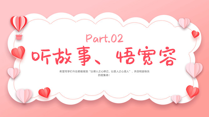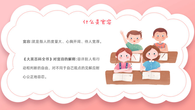 学会宽容主题班会课件PPT模板。包括什么是宽容、听故事悟宽容、宽容度心理测试、学会宽容快乐生活等内容。