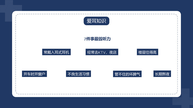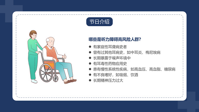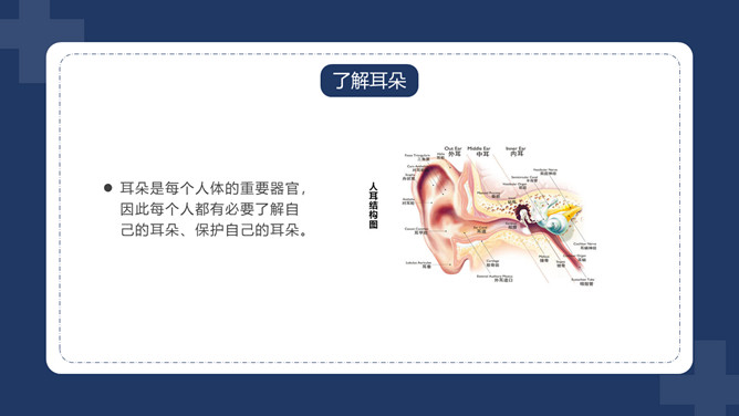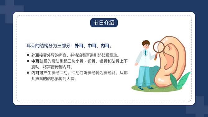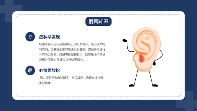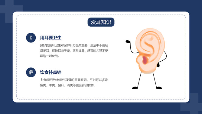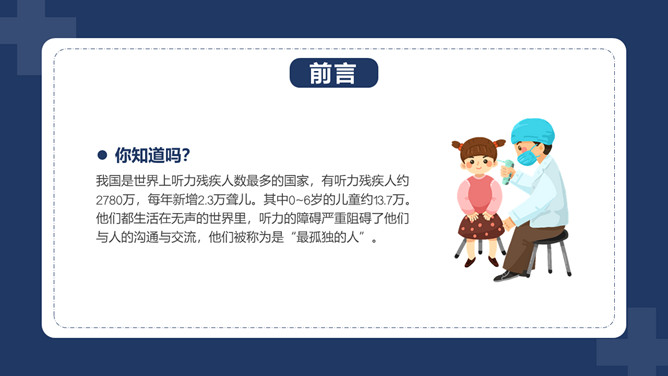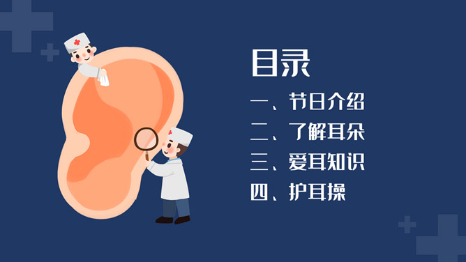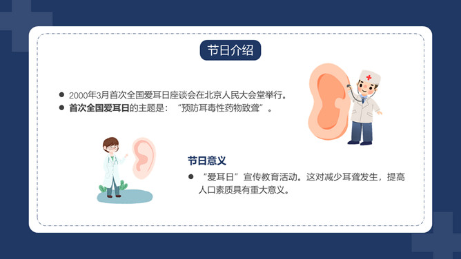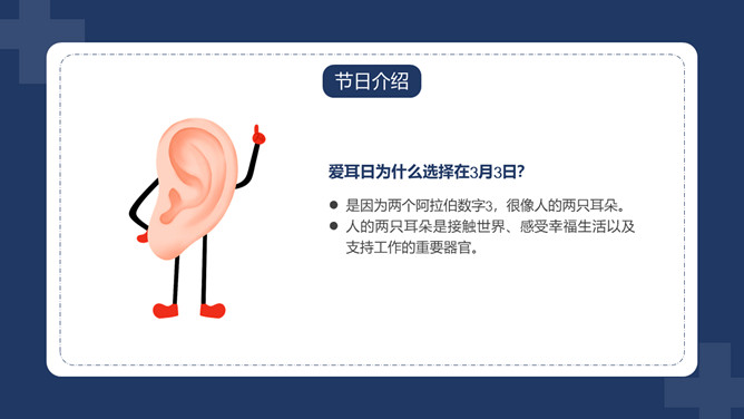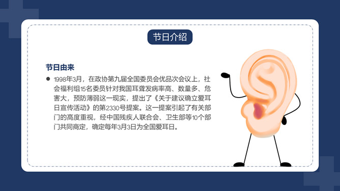 爱护耳朵全国爱耳日PPT模板。中国有听力语言残疾人为残疾人总数的首位。针对耳聋发生率高、数量多、危害大,预防工作薄弱的现实,10部委局共同确定:每年的3月3日为“全国爱耳日”(Ear Care Day)。
