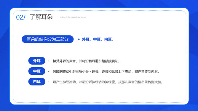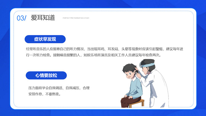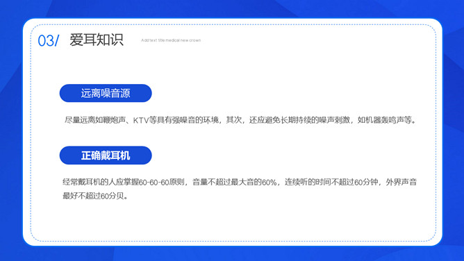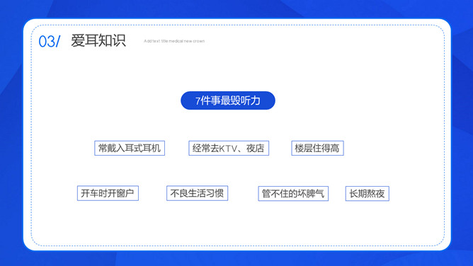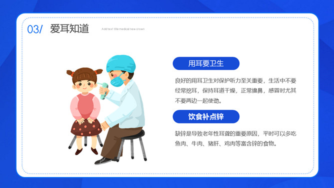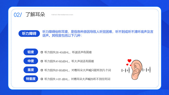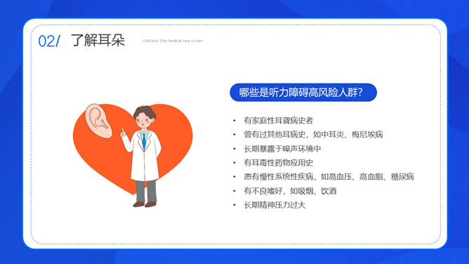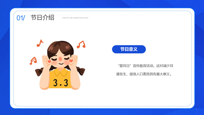 关爱听力健康全国爱耳日PPT模板。你知道吗?我国是世界上听力残疾人数最多的国家,有听力残疾人约2780万,每年新增2.3万聋儿。其中0~6岁的儿童约13.7万。他们都生活在无声的世界里,听力的障碍严重阻碍了他们与人的沟通与交流,他们被称为是“最孤独的人”。