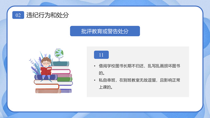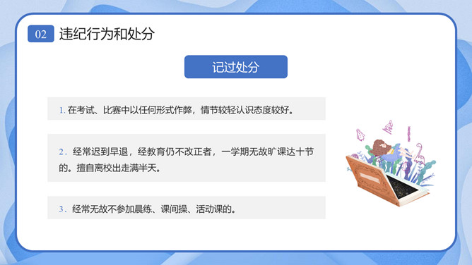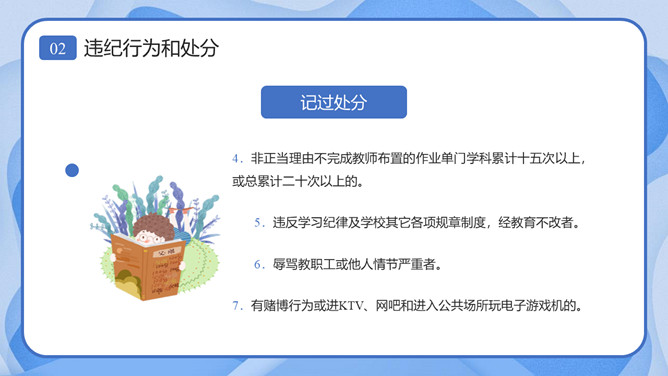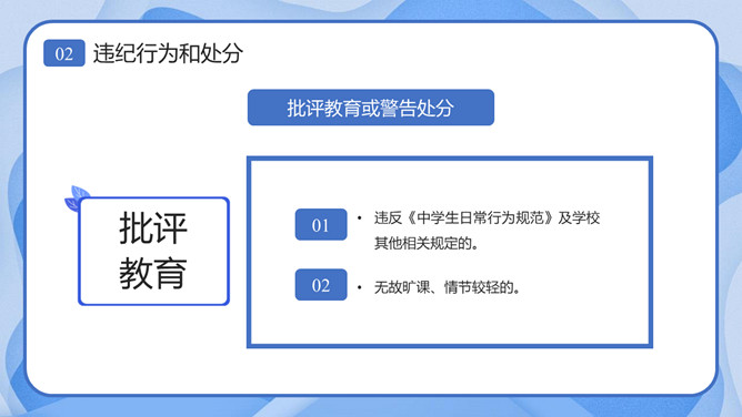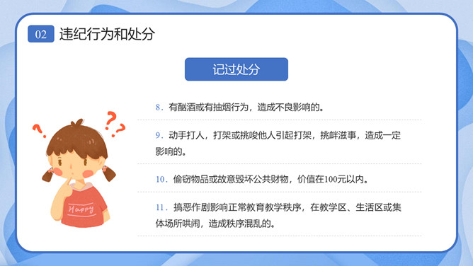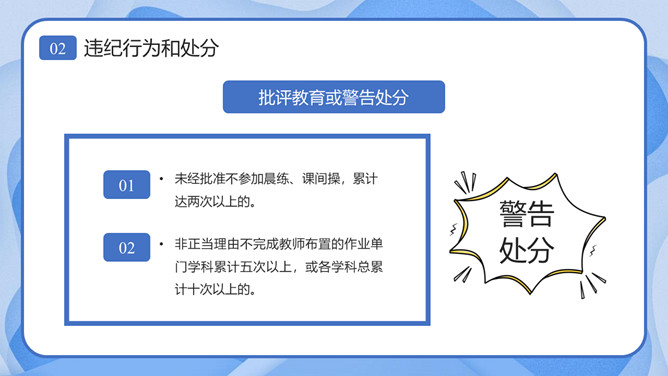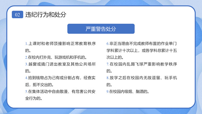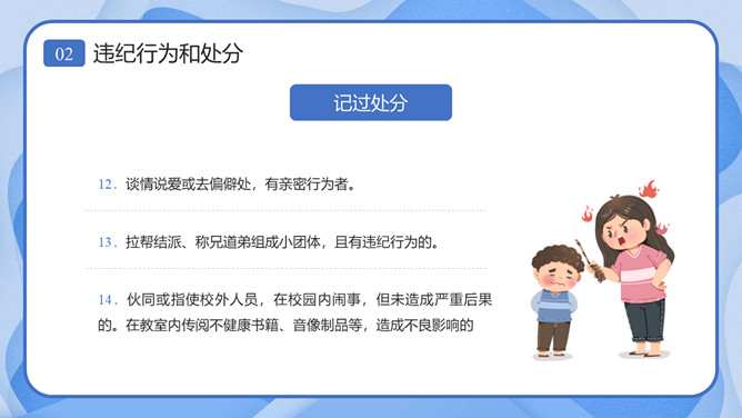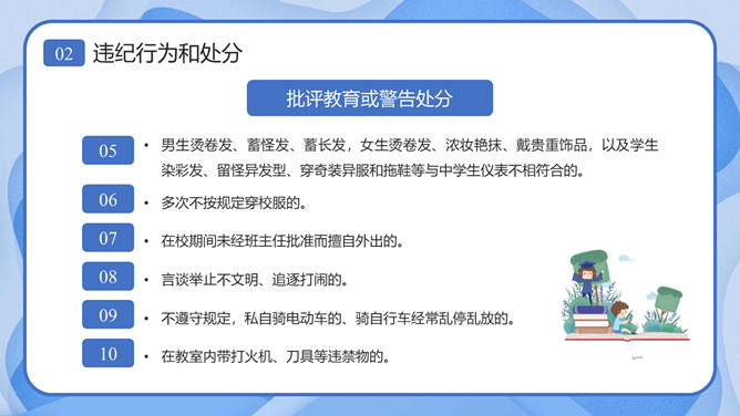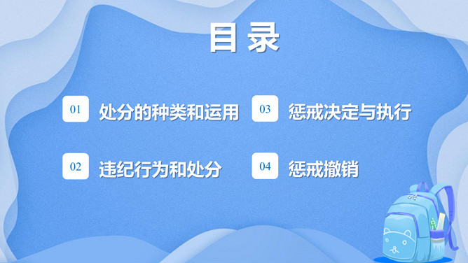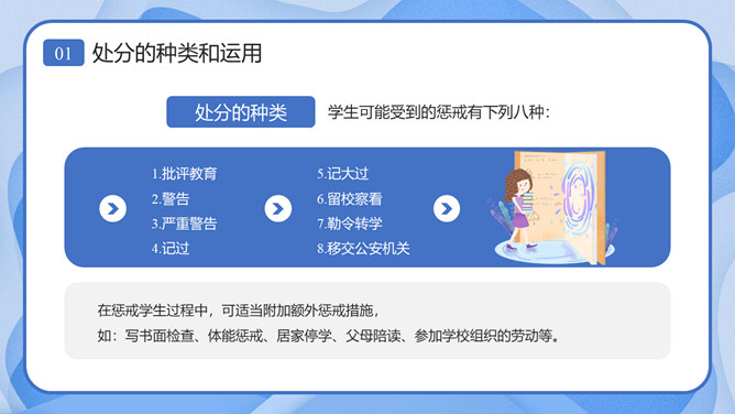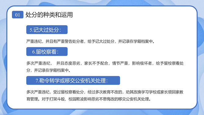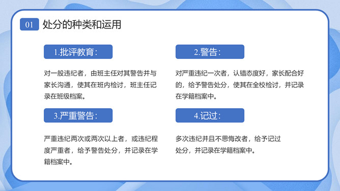 校风校纪整顿主题班会课件PPT模板。内容包括处分的种类和运用、违纪行为和处分、惩戒决定与执行、惩戒撤销。
