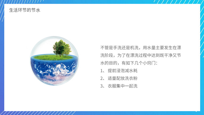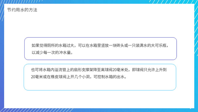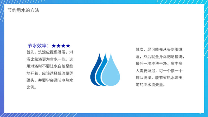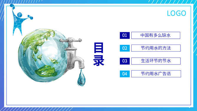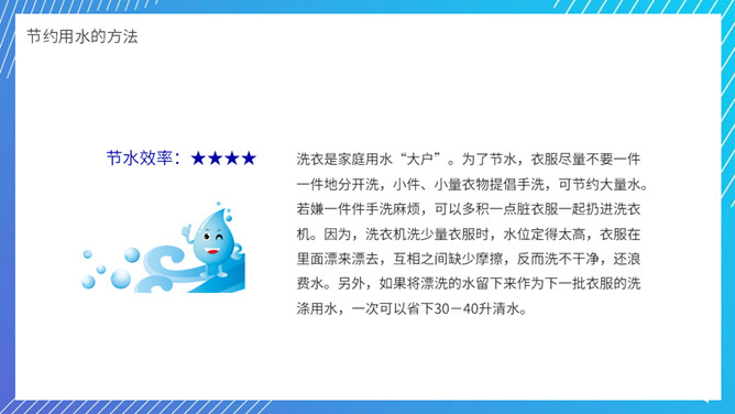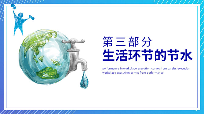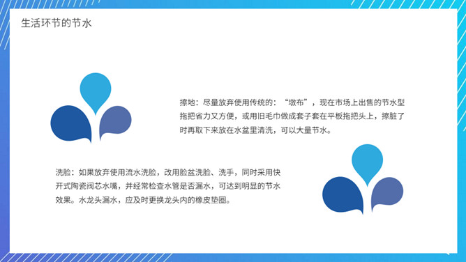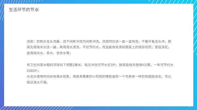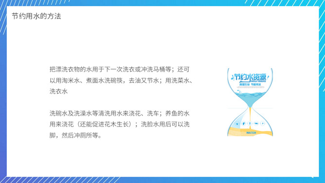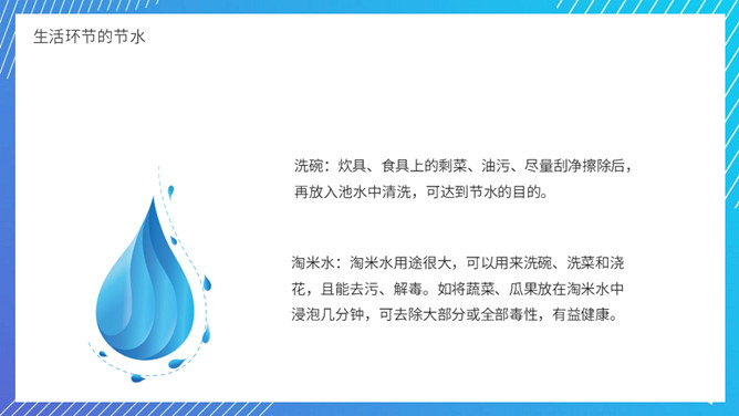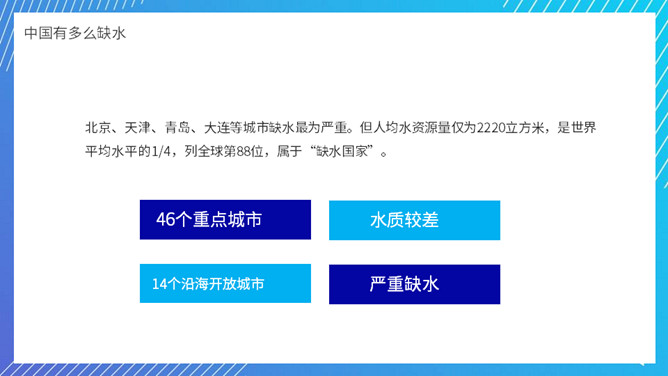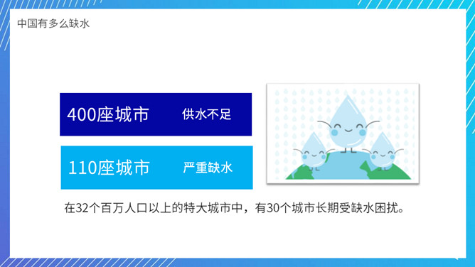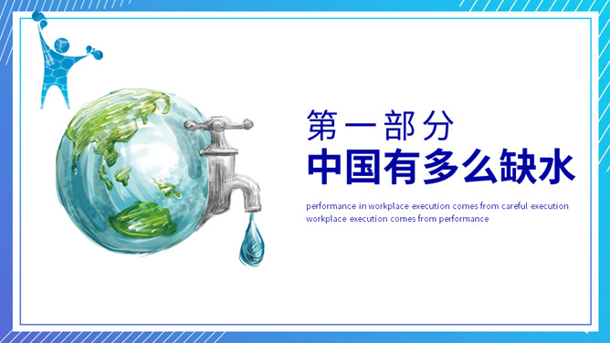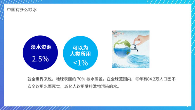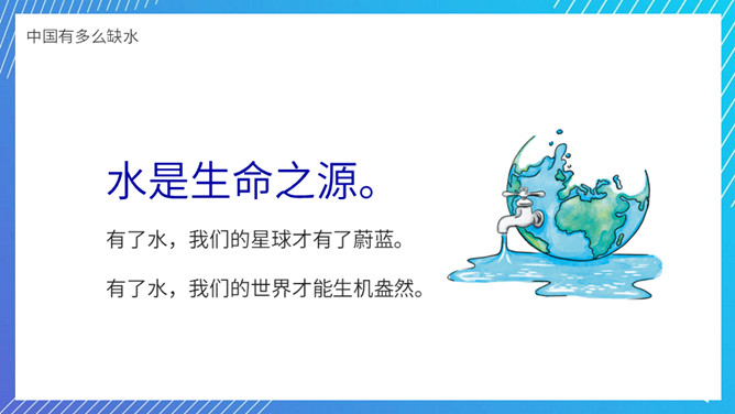 节约用水珍惜水资源PPT模板。内容包括中国有多么缺水、节约用水的方法、生活环节的节水、节约用水广告语。