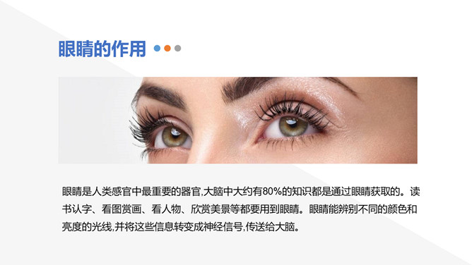 眼睛是人类感官中最重要的器官,大脑中大约有80%的知识都是通过眼睛获取的。读书认字、看图赏画、看人物、欣赏美景等都要用到眼睛。眼睛能辨别不同的颜色和亮度的光线,并将这些信息转变成神经信号,传送给大脑。