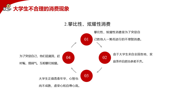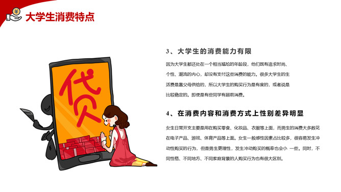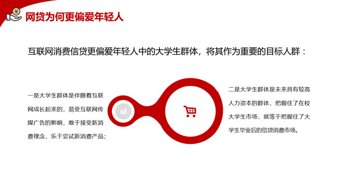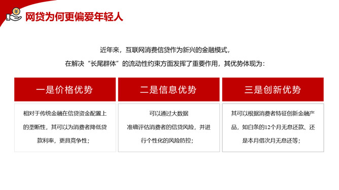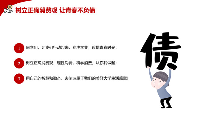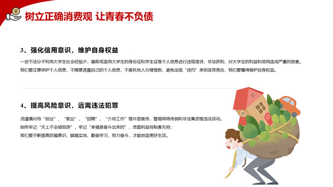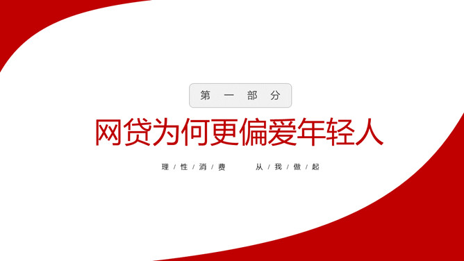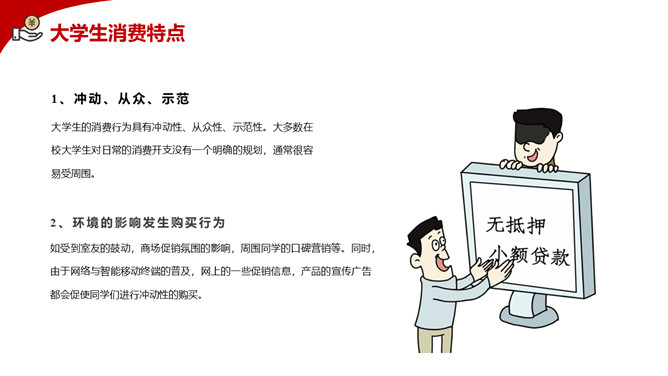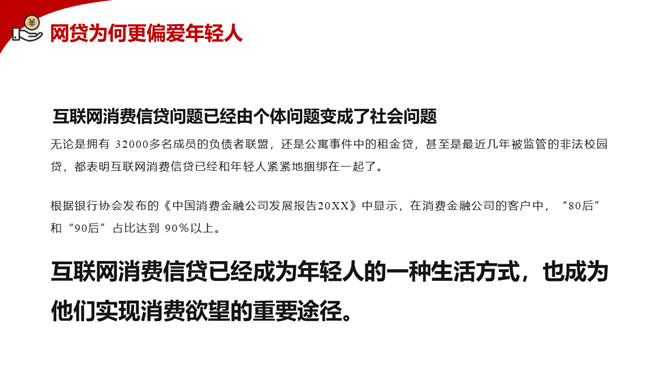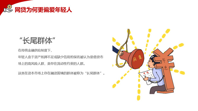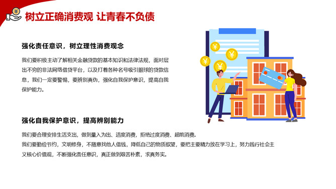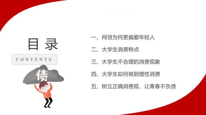 拒绝网贷摆脱网贷困境PPT模板。内容包括网贷为何更偏爱年轻人、大学生消费特点、大学生不合理的消费现象、大学生如何做到理性消费、树立正确消费观让青春不负债。