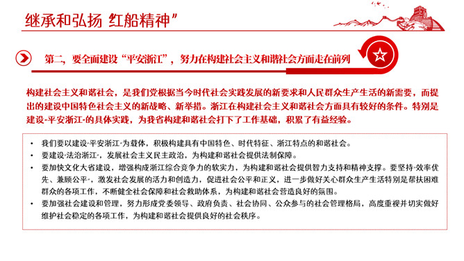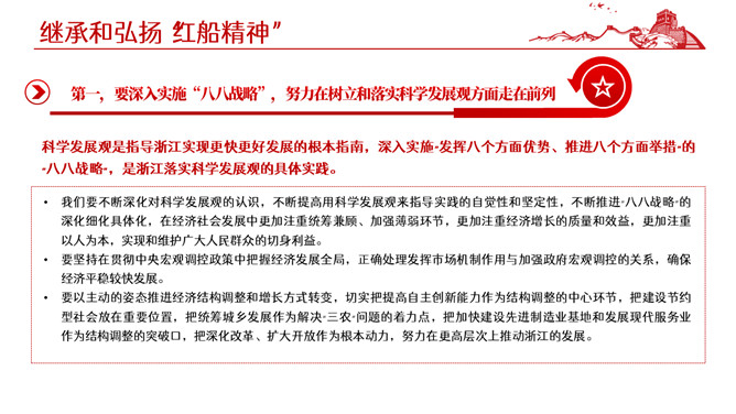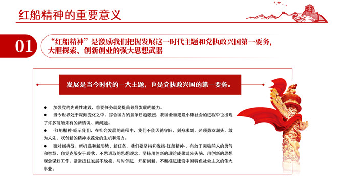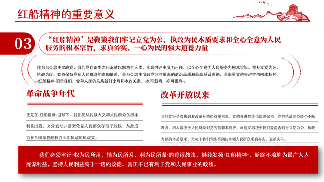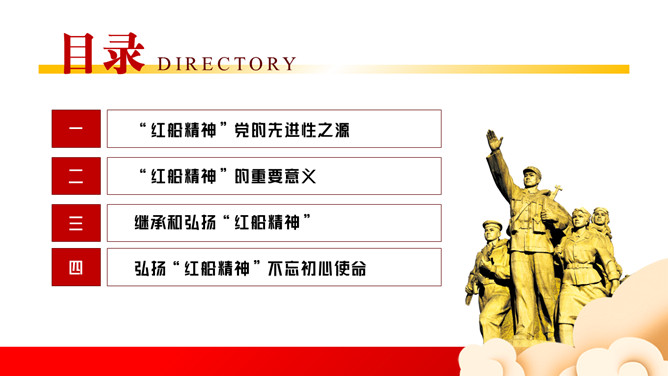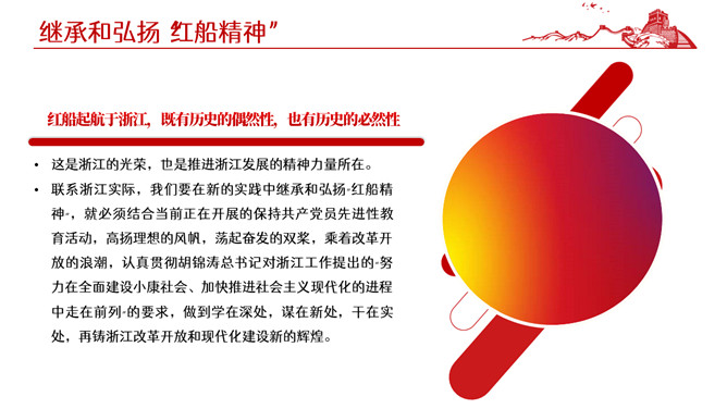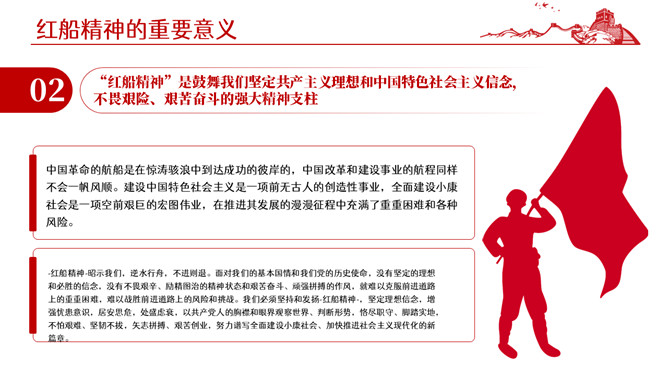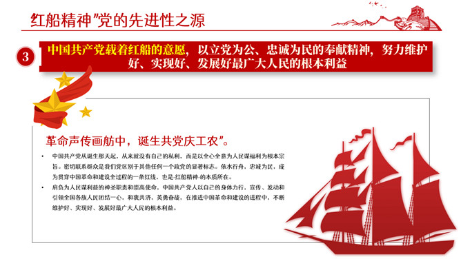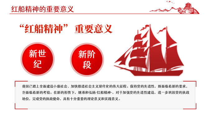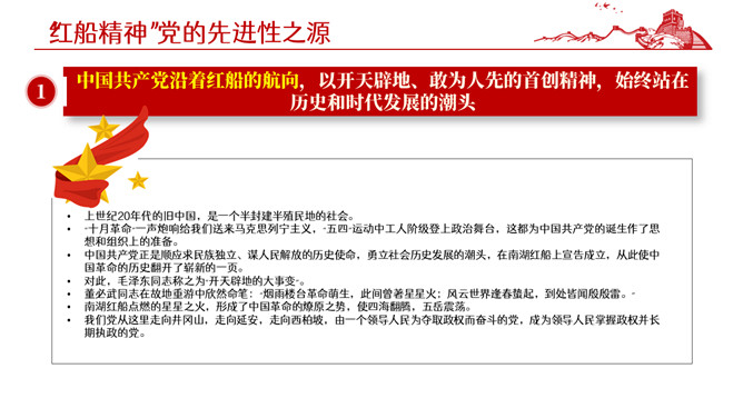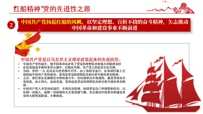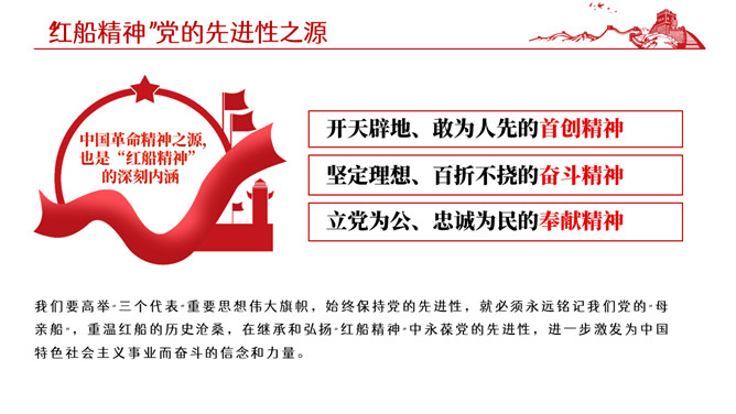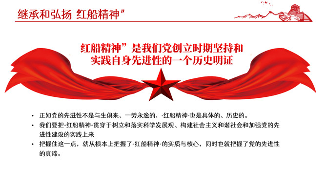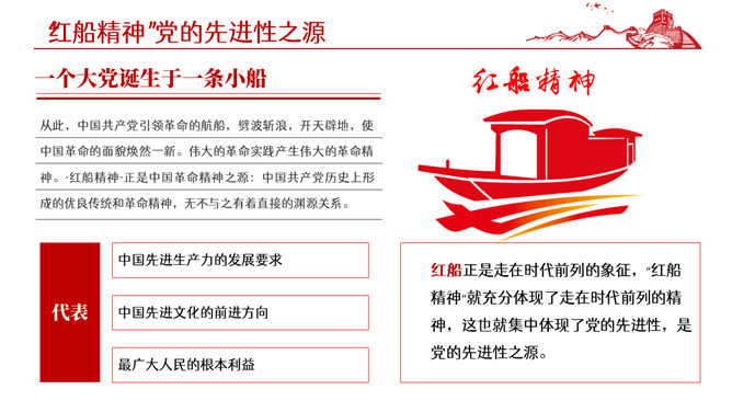 红船精神主题党课PPT模板。内容包括“红船精神”党的先进性之源、“红船精神”的重要意义、继承和弘扬“红船精神”、弘扬“红船精神”不忘初心使命。