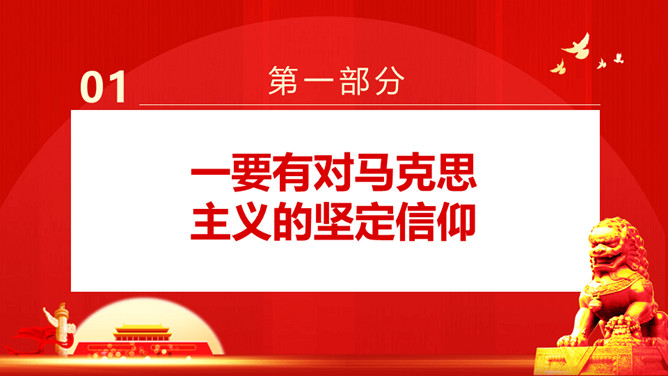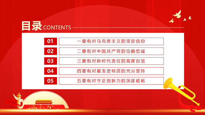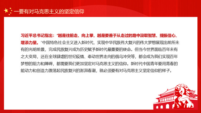 新时代中国青年要有的样子PPT模板。内容包括要有对马克思主义的坚定信仰、要有对中国共产党的信赖忠诚、要有对新时代责任的高度自觉、要有对最宝贵特质的充分坚持、要有对守正创新力的深度砥砺。