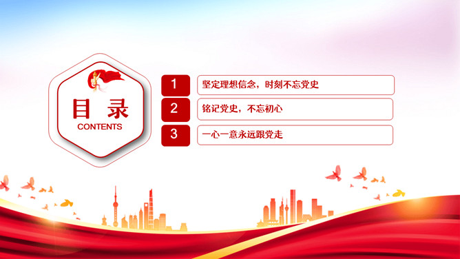 铭记党史不忘初心PPT模板。内容包括坚定理想信念时刻不忘党史、铭记党史不忘初心、一心一意永远跟党走。