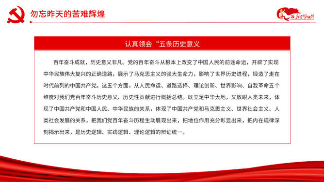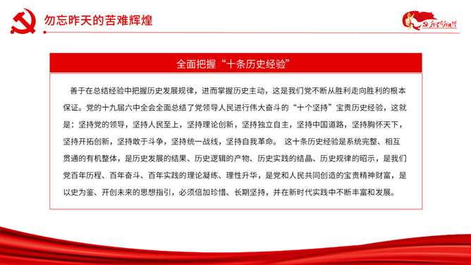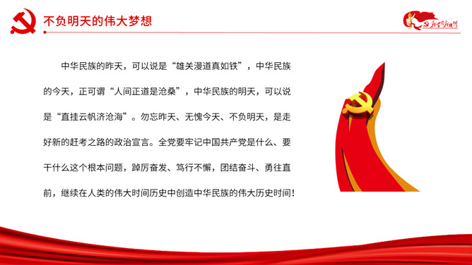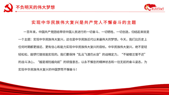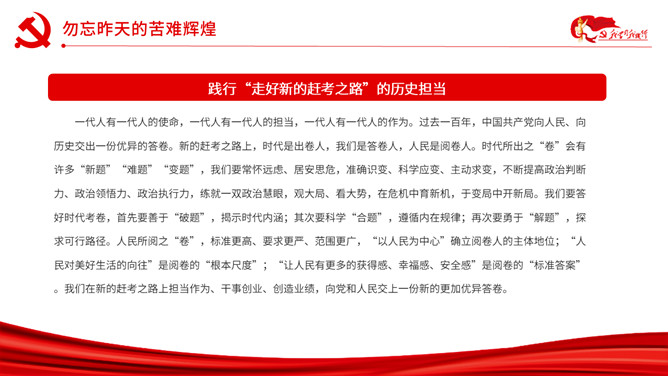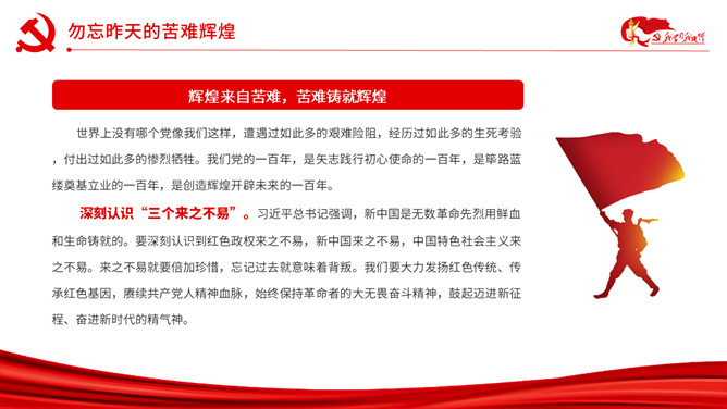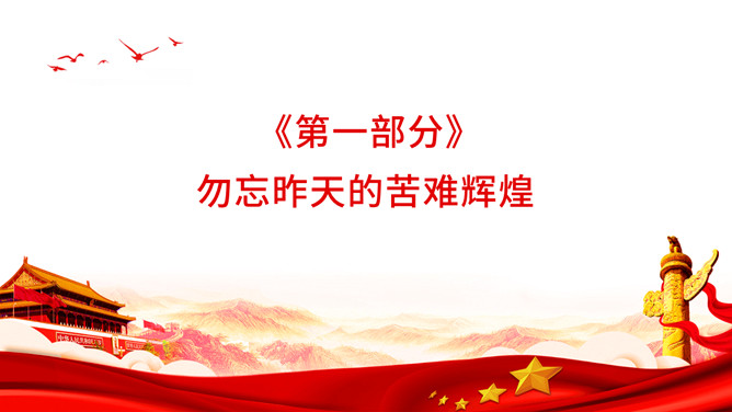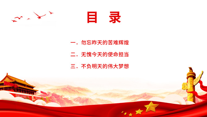 以史为鉴开创未来百年奋斗再启新程PPT模板。内容包括勿忘昨天的苦难辉煌、无愧今天的使命担当、不负明天的伟大梦想。