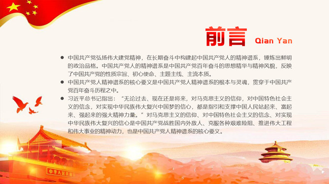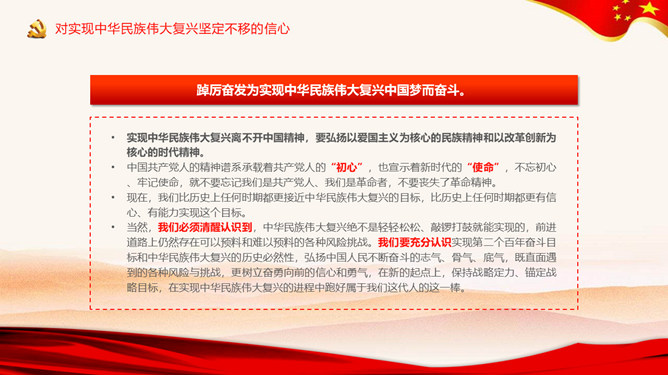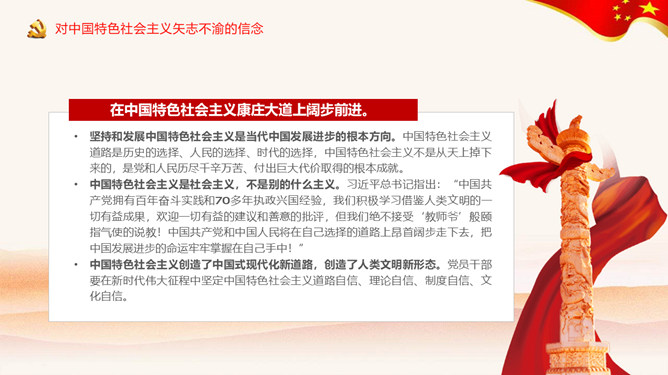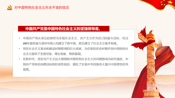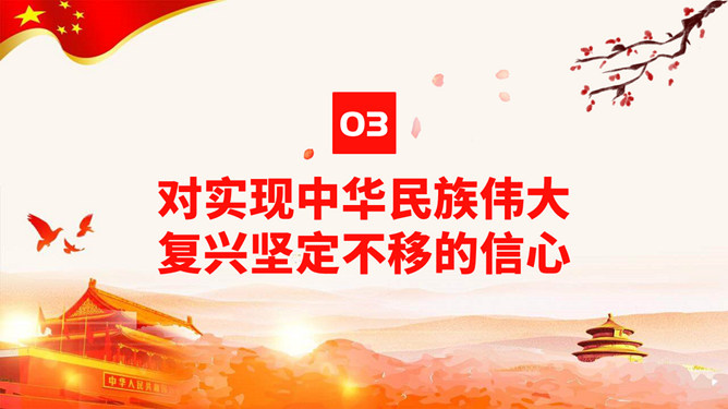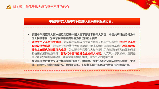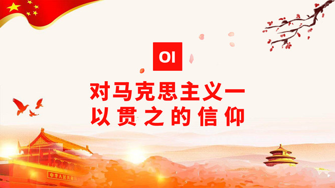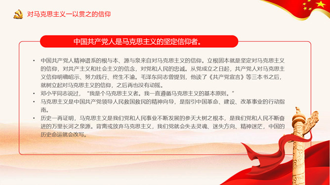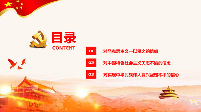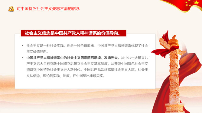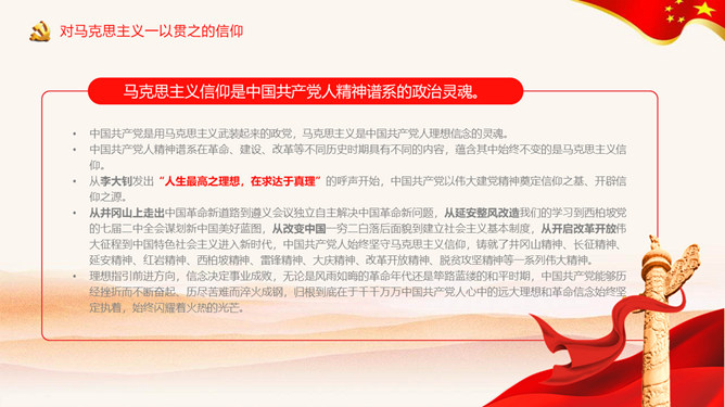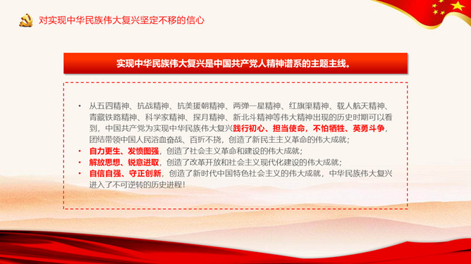 共产党人精神谱系的核心要义PPT模板。内容包括对马克思主义一以贯之的信仰、对中国特色社会主义矢志不渝的信念、对实现中华民族伟大复兴坚定不移的信心。