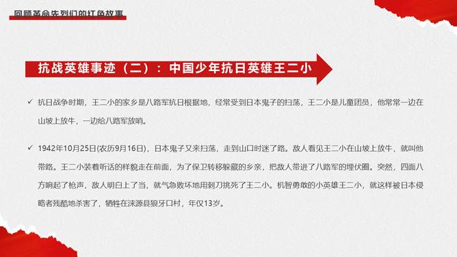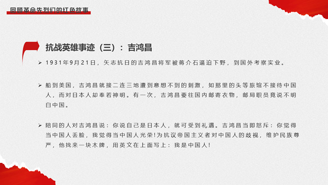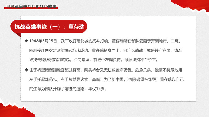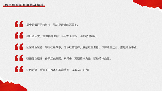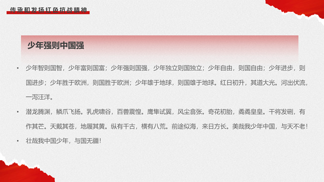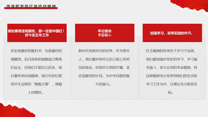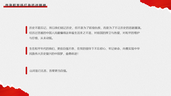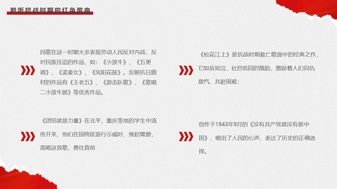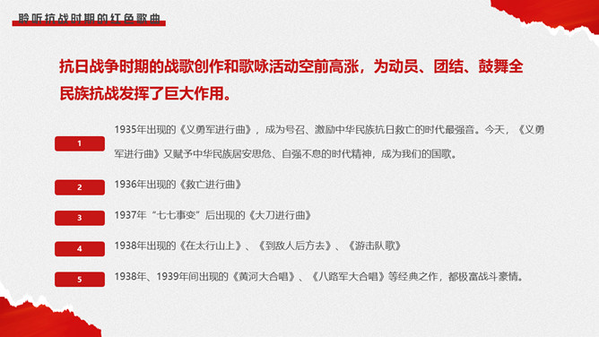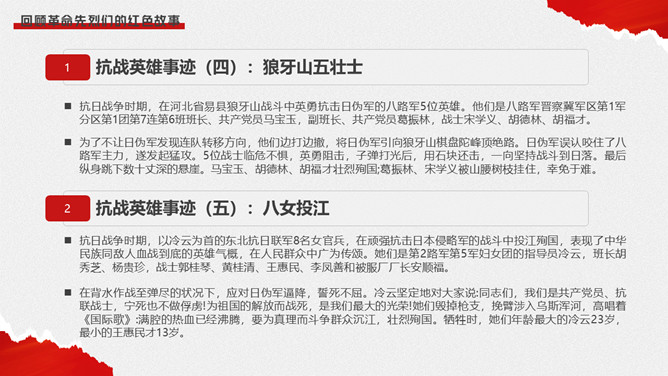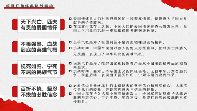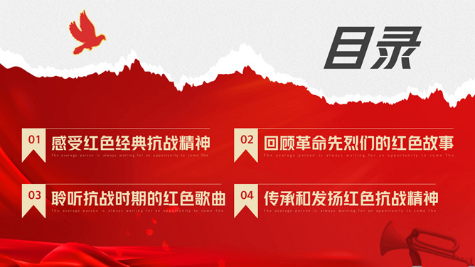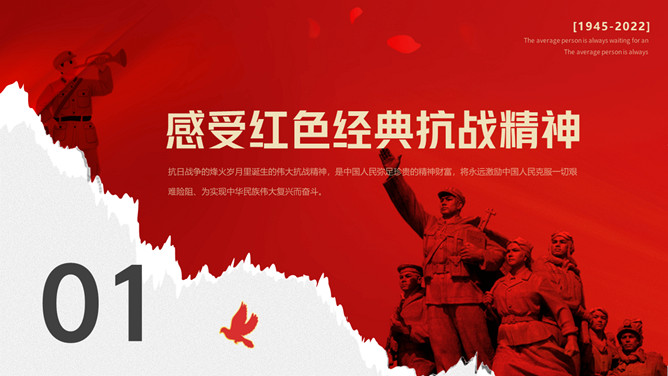 峥嵘岁月传抗战精神PPT模板。内容包括感受红色经典抗战精神、回顾革命先烈们的红色故事、聆听抗战时期的红色歌曲、传承和发扬红色抗战精神。