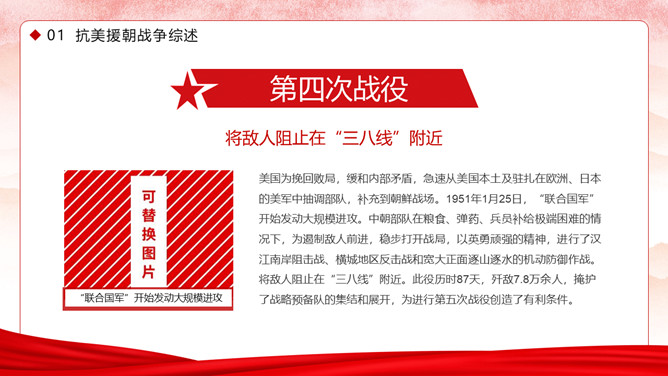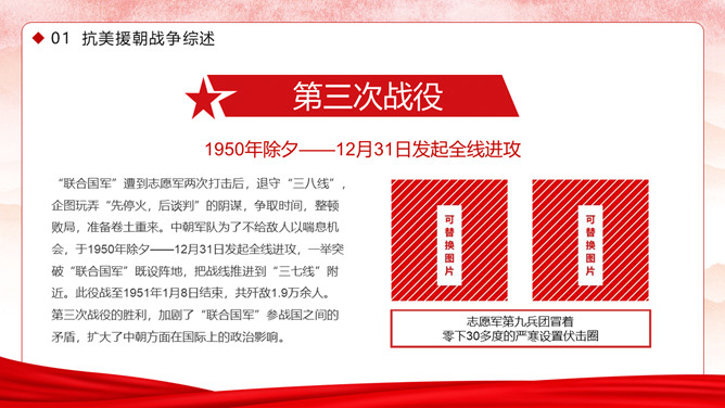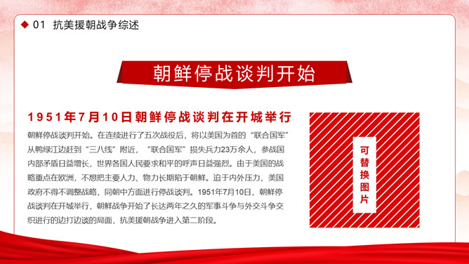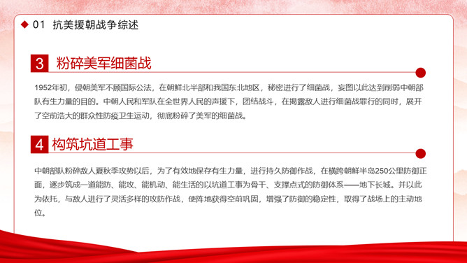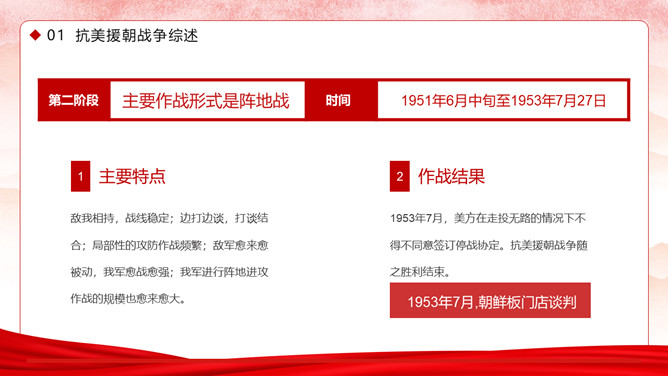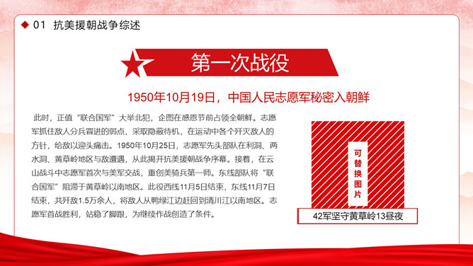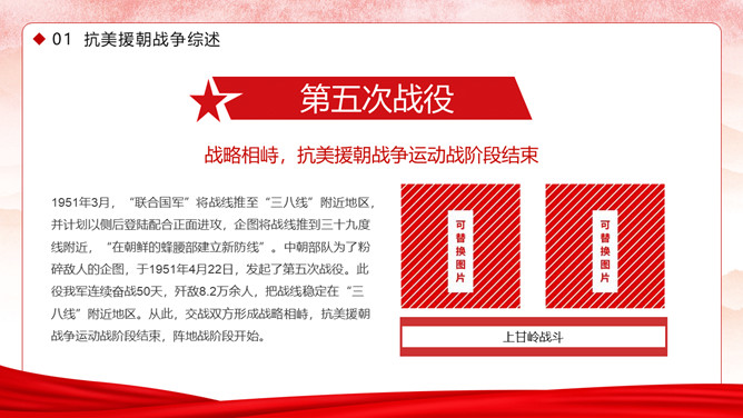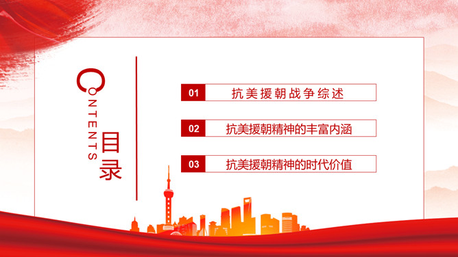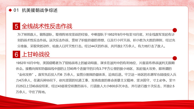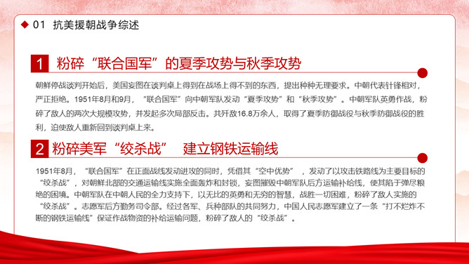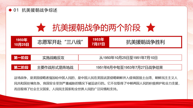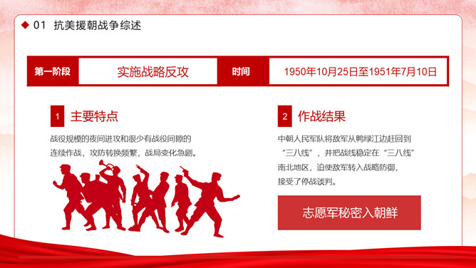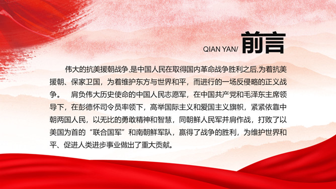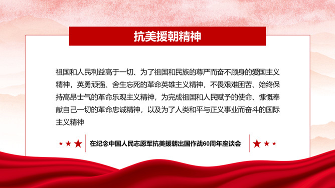 抗美援朝精神传承PPT模板。内容包括抗美援朝战争综述、抗美援朝精神的丰富内涵和时代价值。