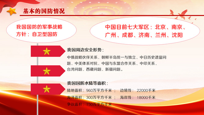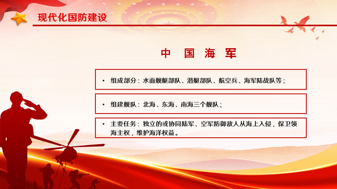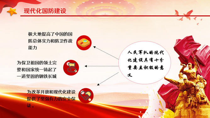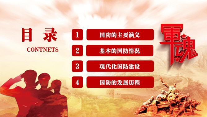 热血铸军魂国防教育PPT模板。内容包括国防的主要涵义、基本的国防情况、现代化国防建设、国防的发展历程。