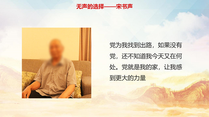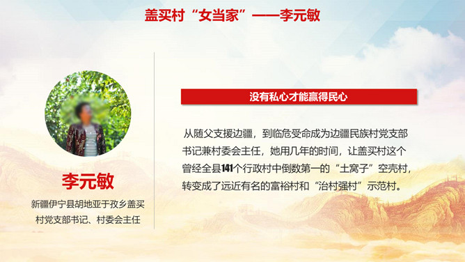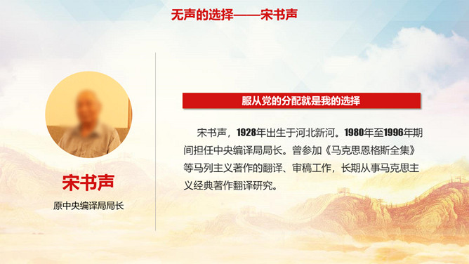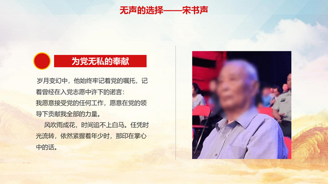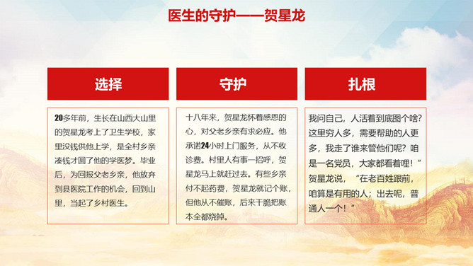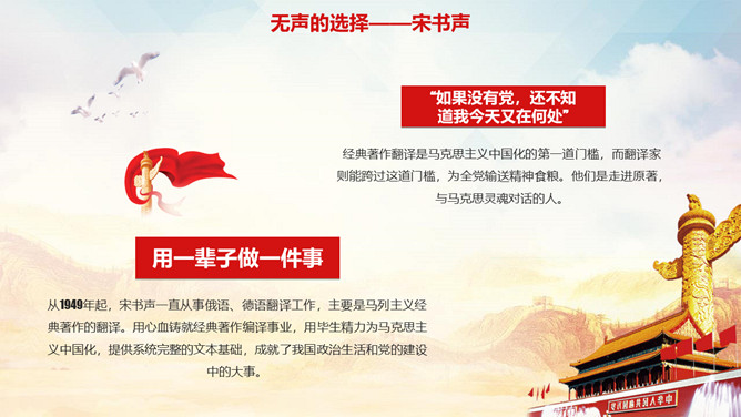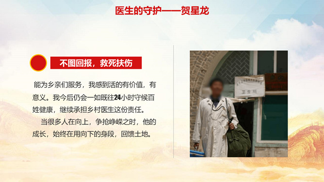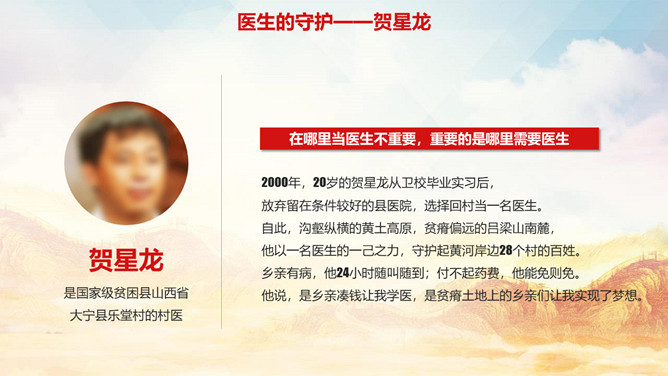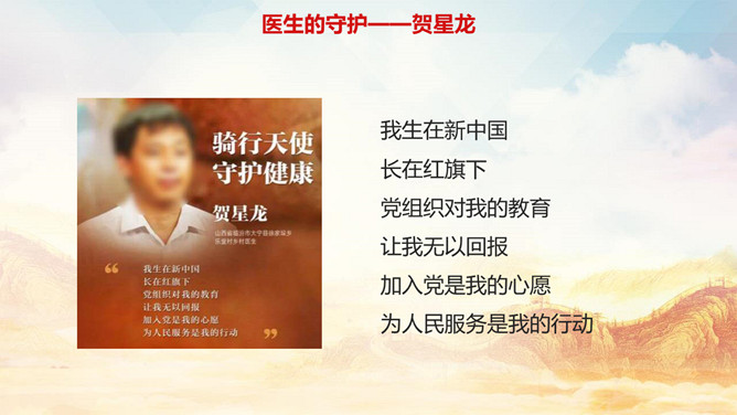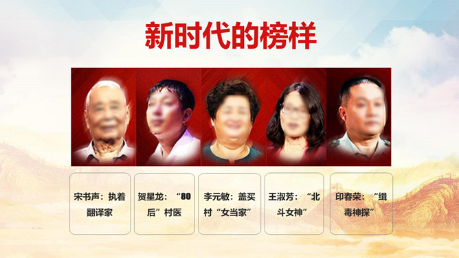 人民英雄榜样的力量PPT模板。内容包括无声的选择——宋书声、医生的守护——贺星龙、盖买村“女当家”——李元敏、“北斗女神”——王淑芳、“缉毒神探”——印春荣。