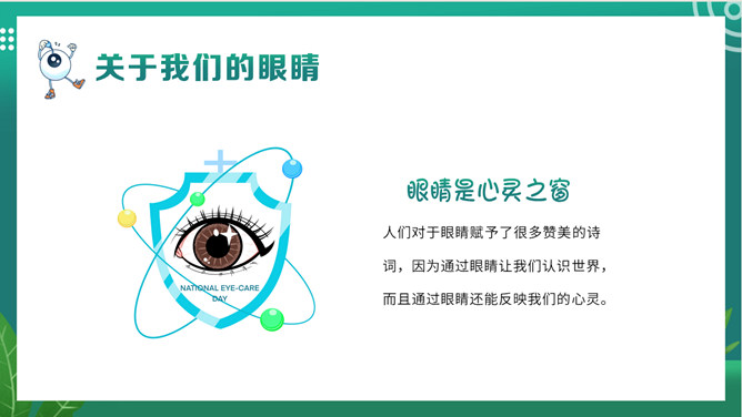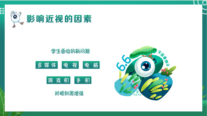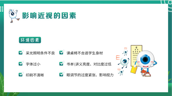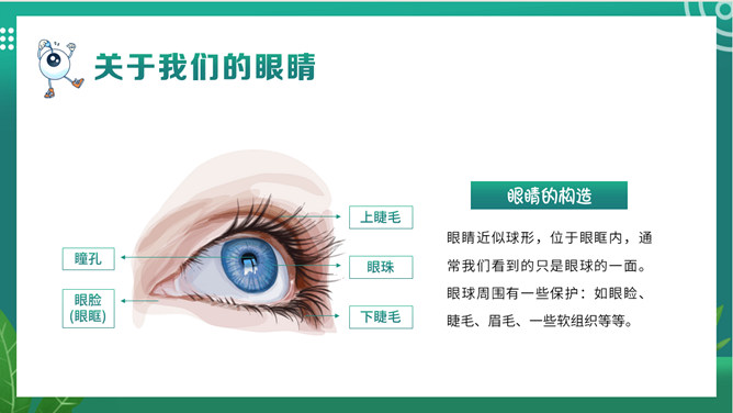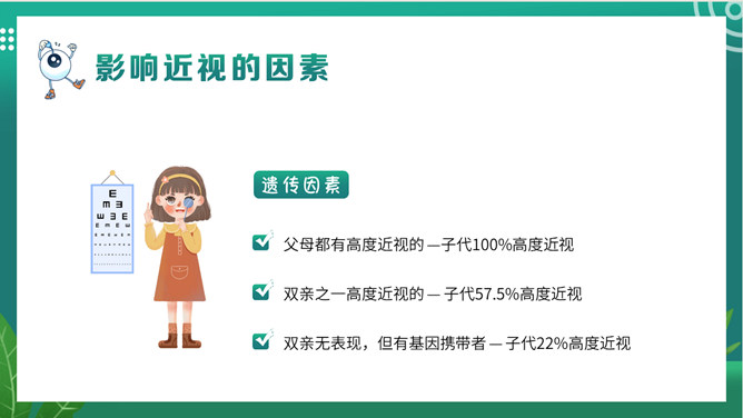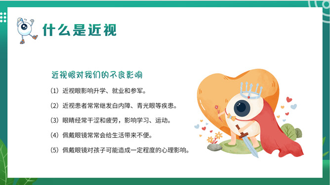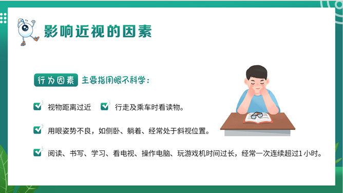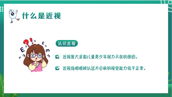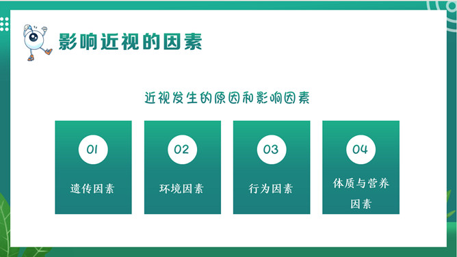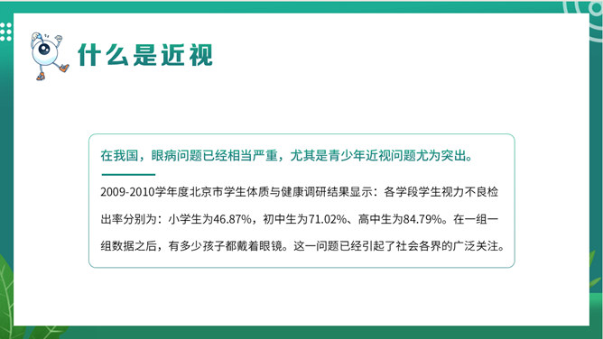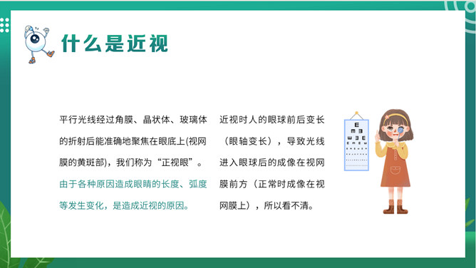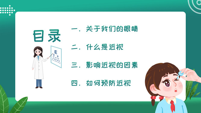关注眼睛健康预防近视班会PPT模板。内容包括关于我们的眼睛、什么是近视、影响近视的因素、如何预防近视。