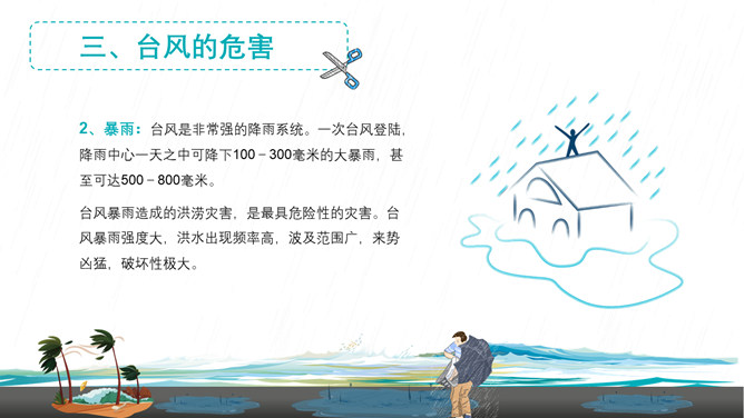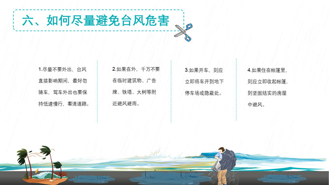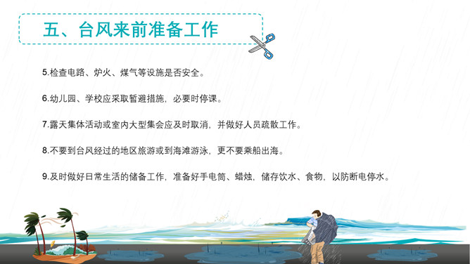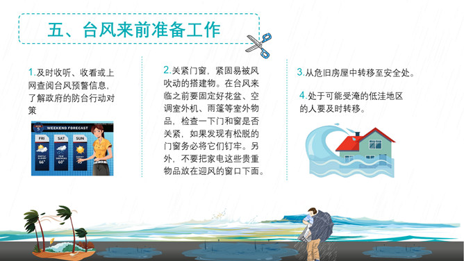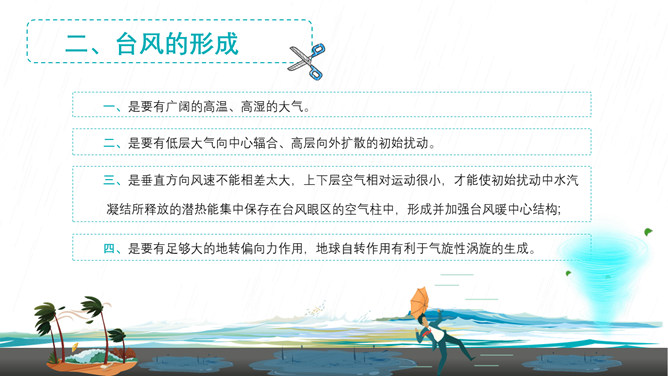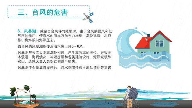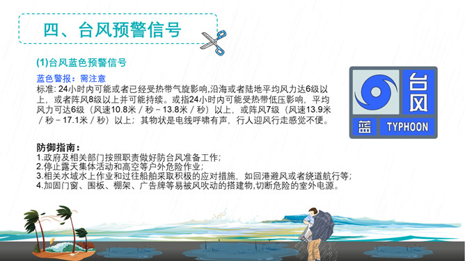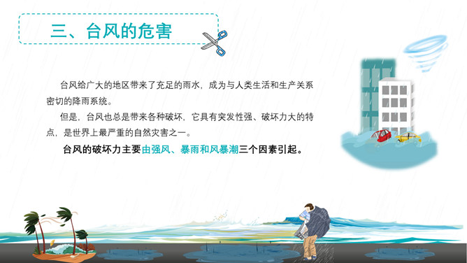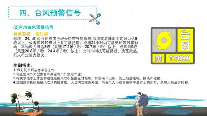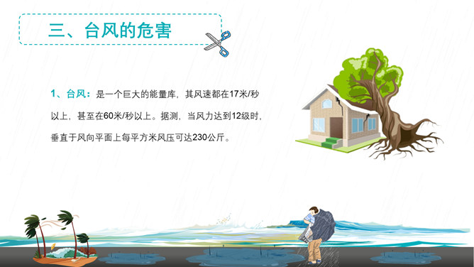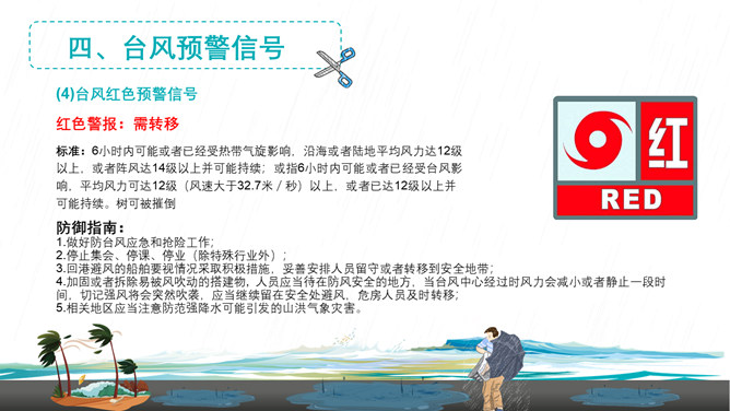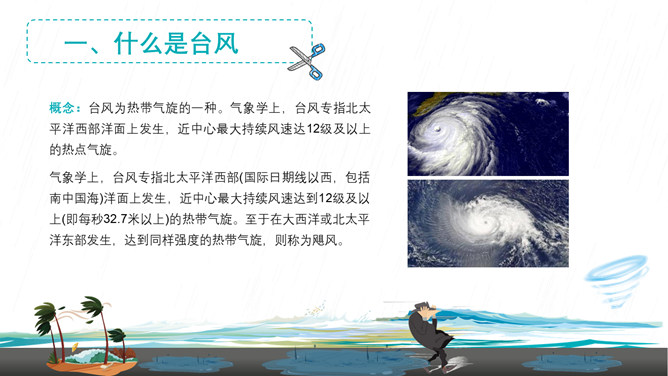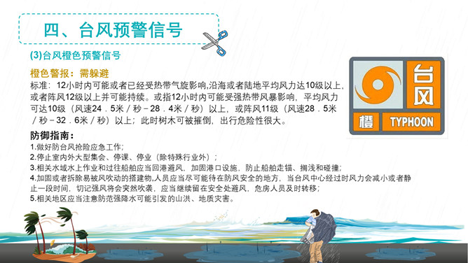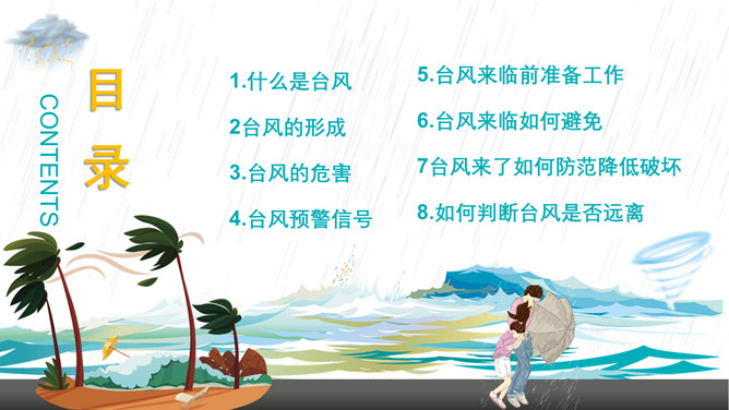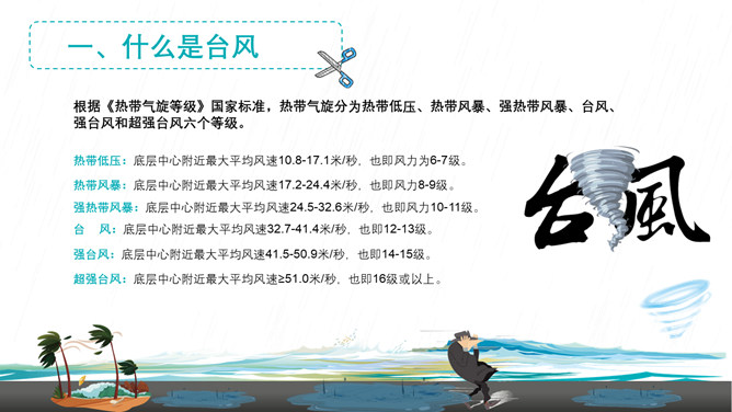 防台风安全教育班会PPT模板。内容包括什么是台风、台风的形成、台风的危害、台风预警信号、台风来临前准备工作、台风来临如何避免、台风来了如何防范降低破坏、如何判断台风是否远离。