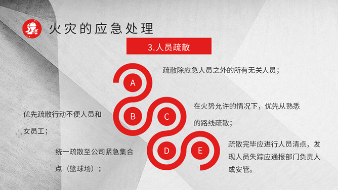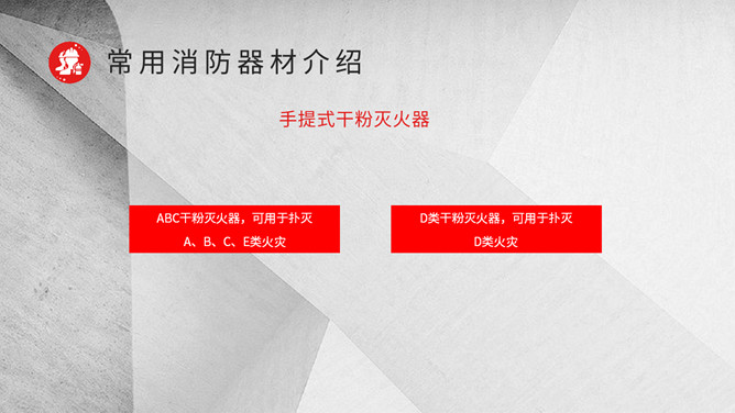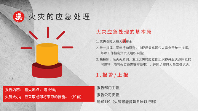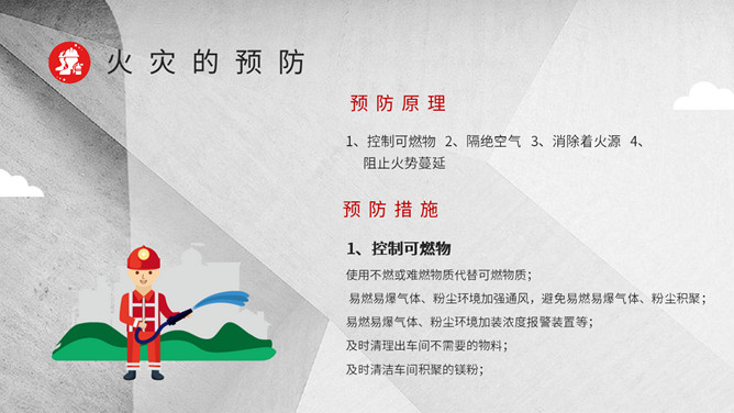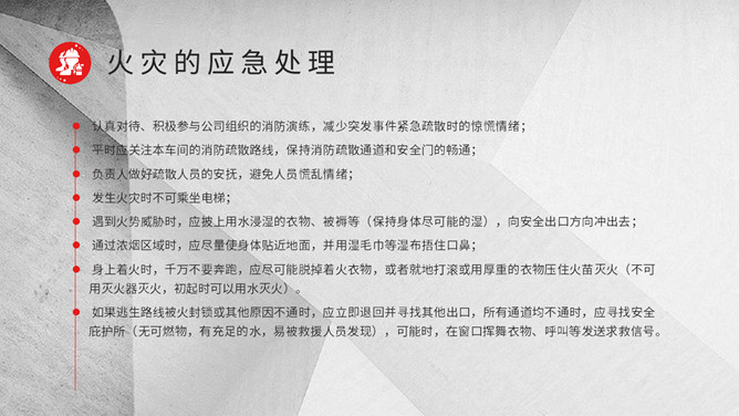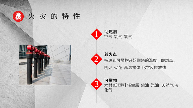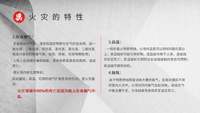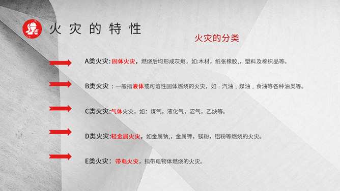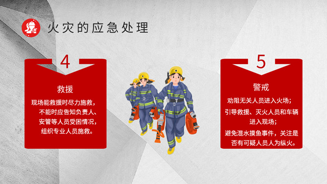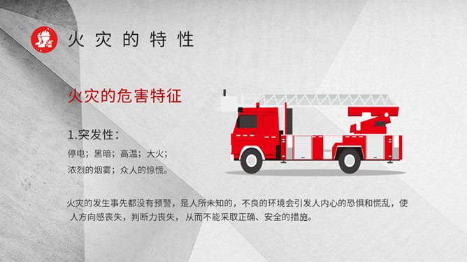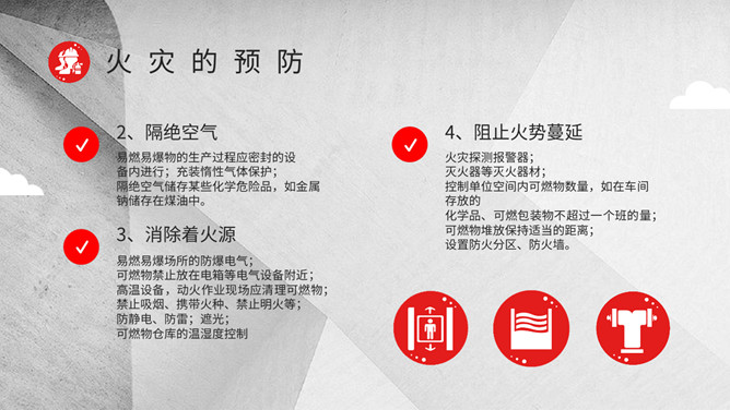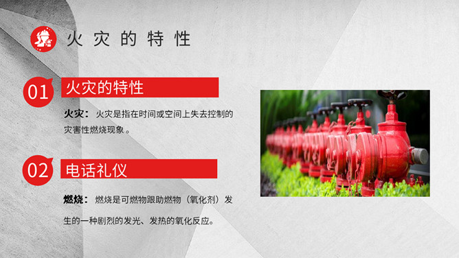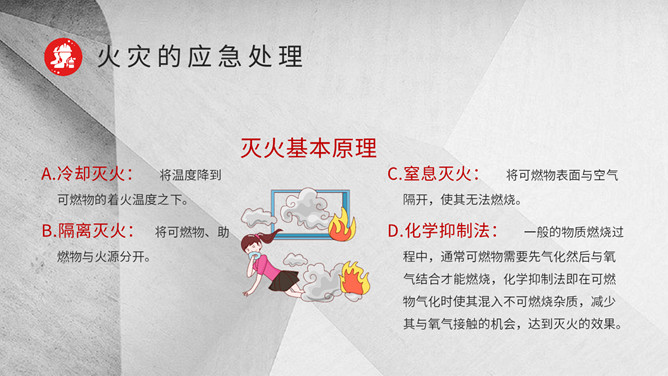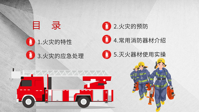 远离火灾消防知识课件PPT模板。内容包括火灾的特性、火灾的预防、火灾的应急处理、常用消防器材介绍、灭火器材使用实操。