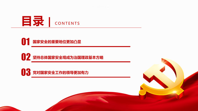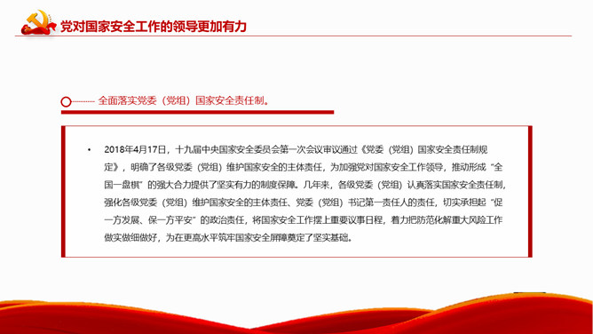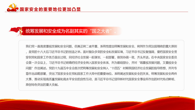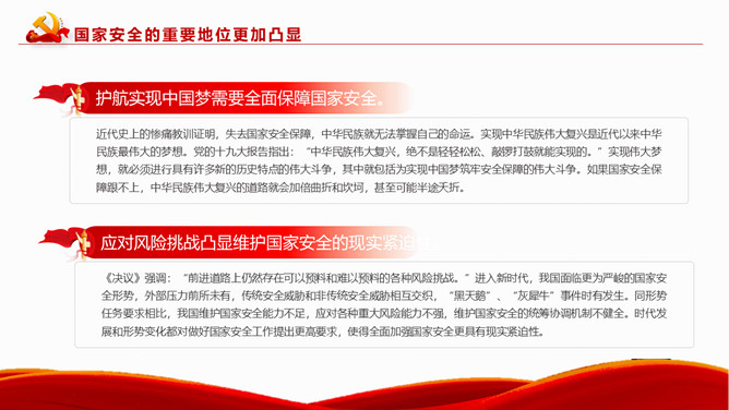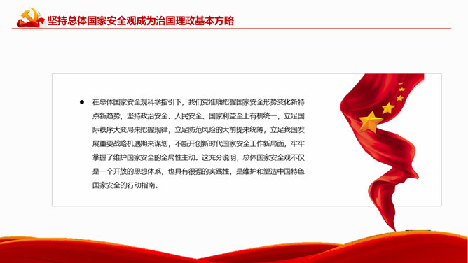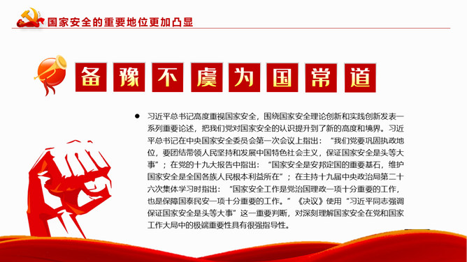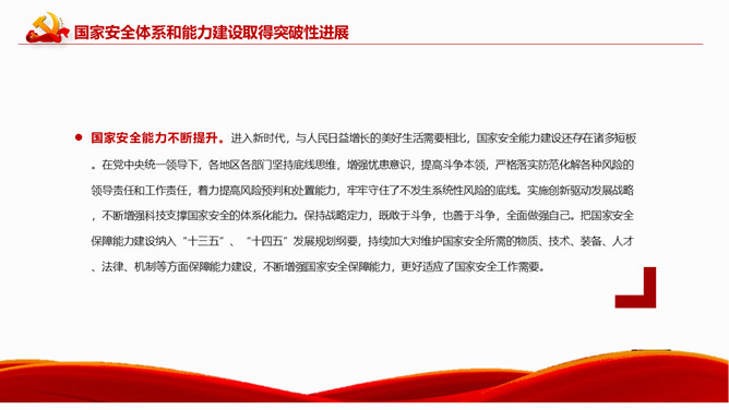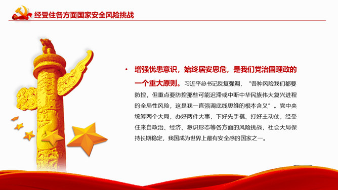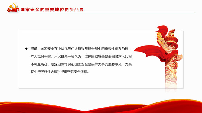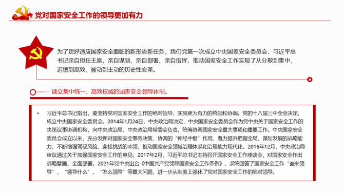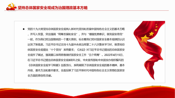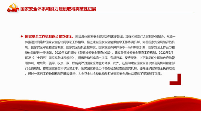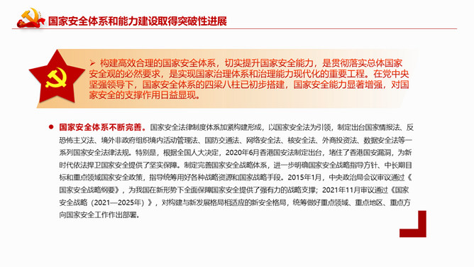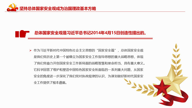 深入把握国家安全伟大成就PPT模板。内容包括国家安全的重要地位更加凸显、坚持总体国家安全观成为治国理政基本方略、党对国家安全工作的领导更加有力、国家安全体系和能力建设取得突破性进展、经受住各方面国家安全风险挑战、维护国家安全的民心基础更加巩固。