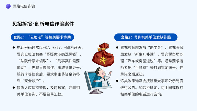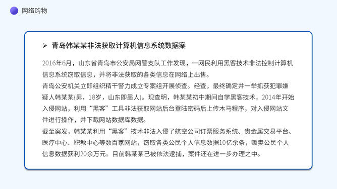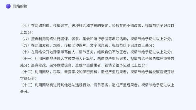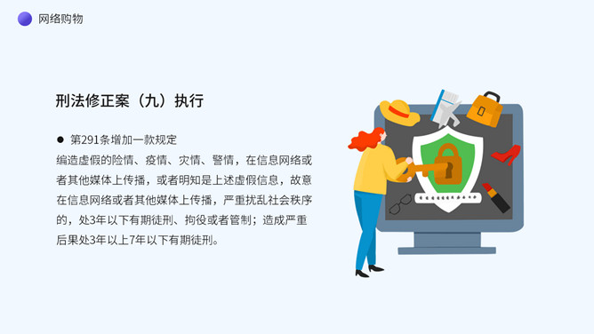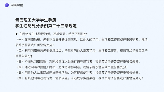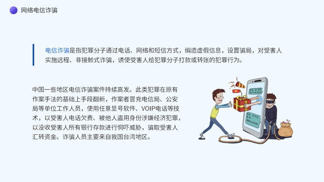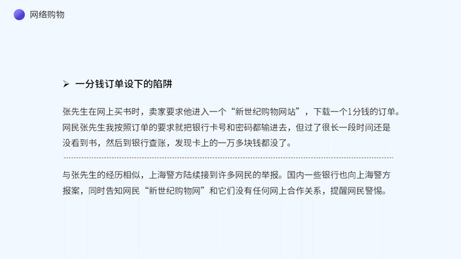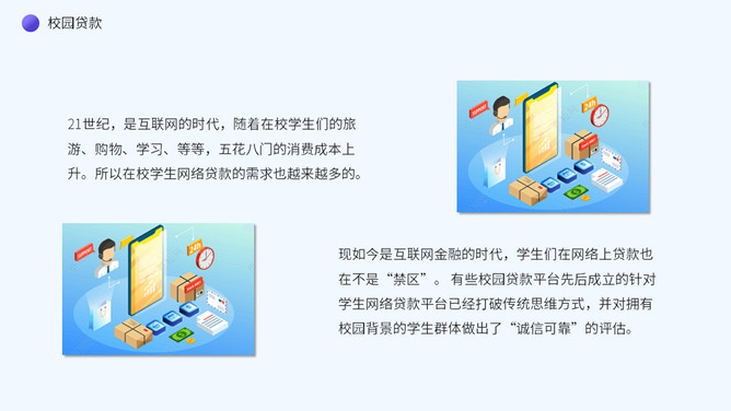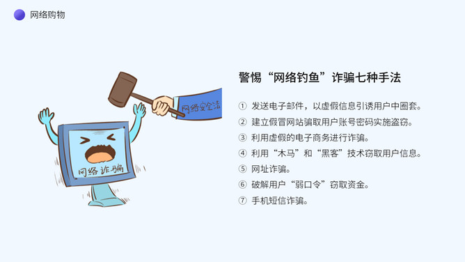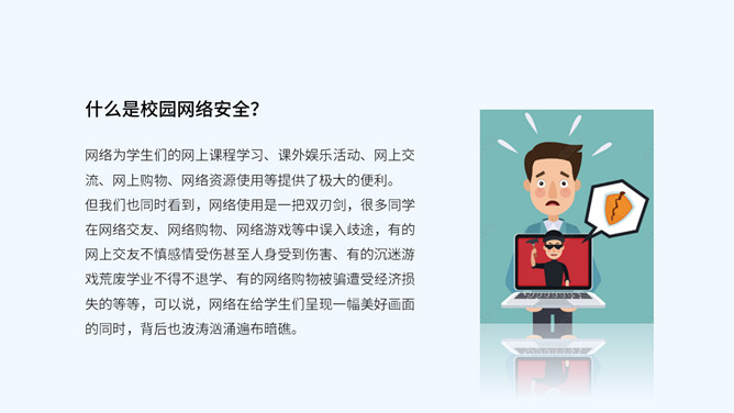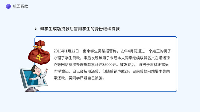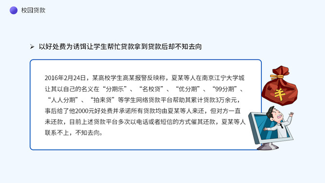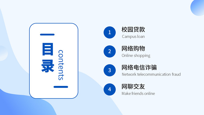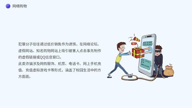 校园网络安全主题班会课件PPT模板。内容包括校园贷款、网络购物、网络电信诈骗、网聊交友。