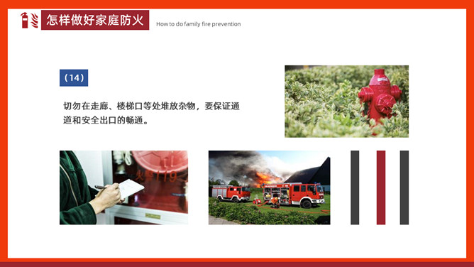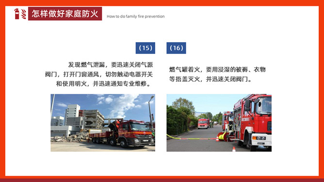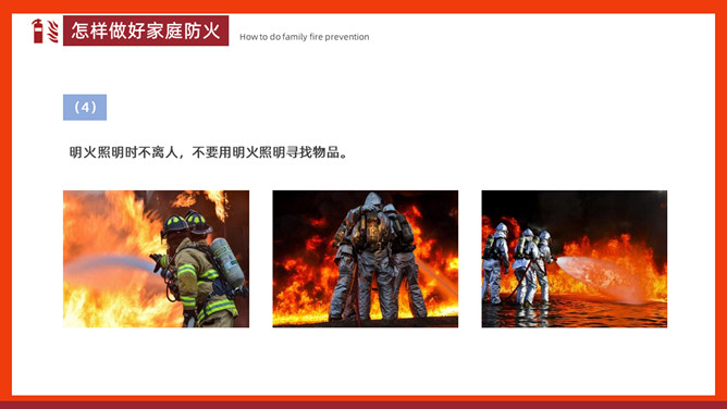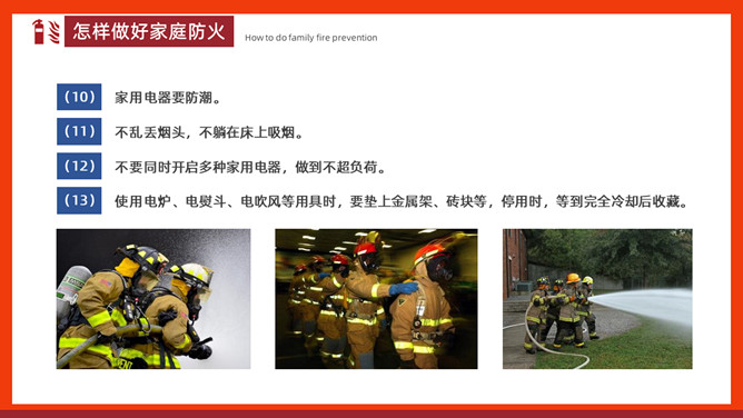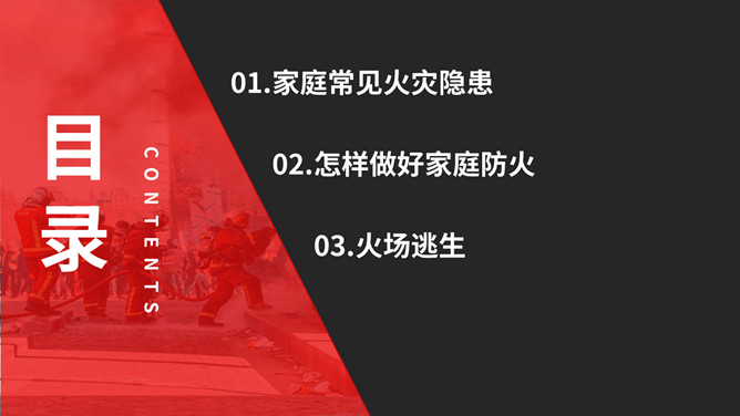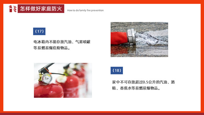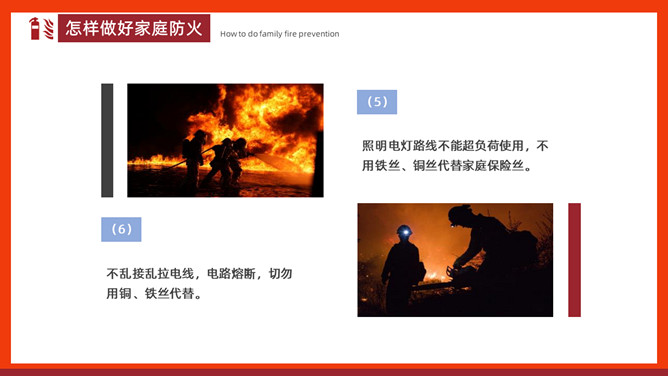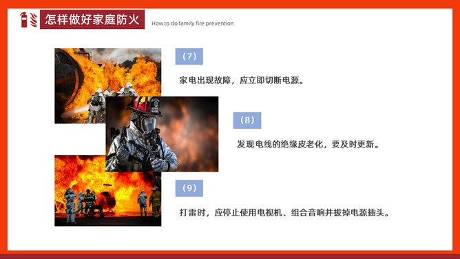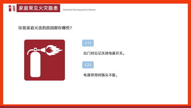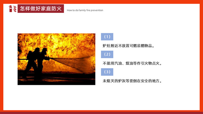 家庭防火安全教育班会PPT模板。内容包括家庭常见火灾隐患、怎样做好家庭防火、火场逃生。