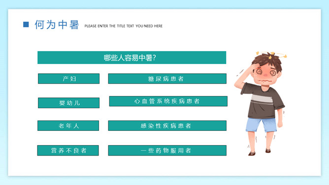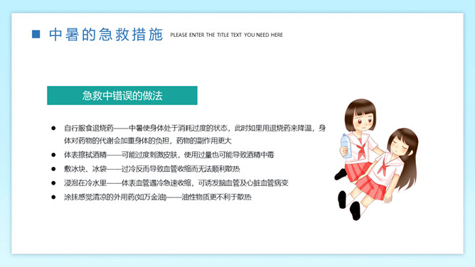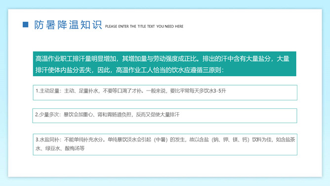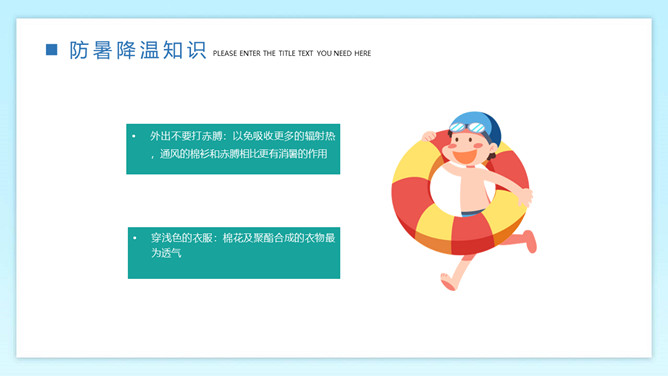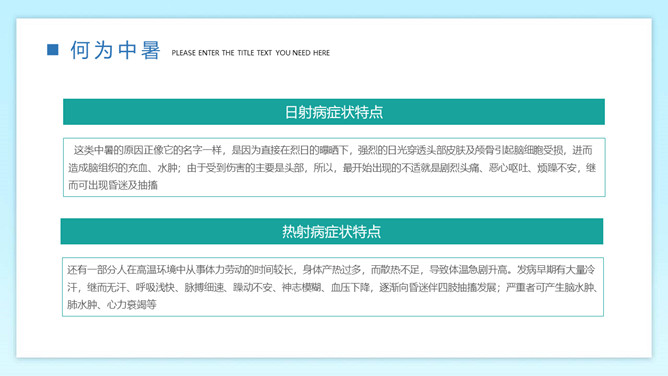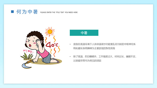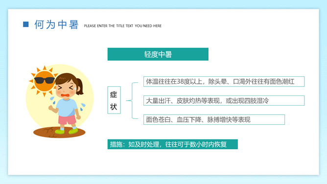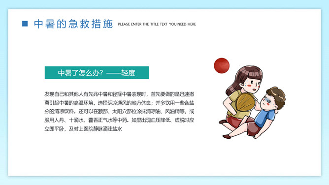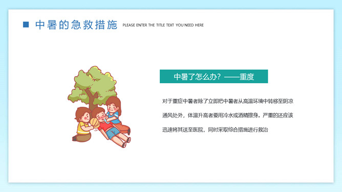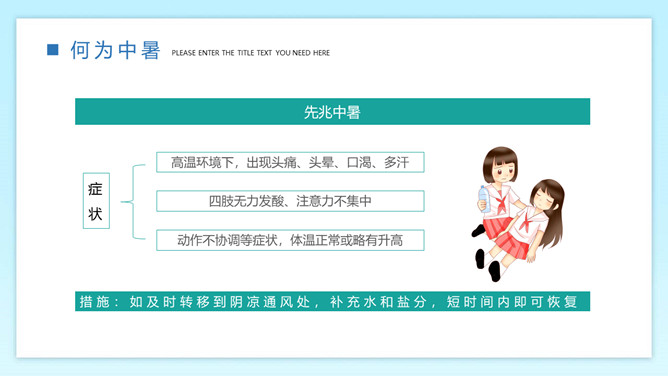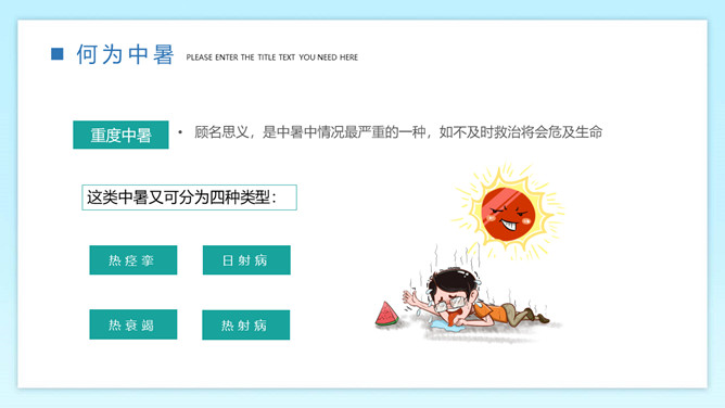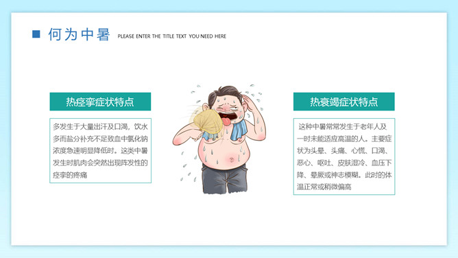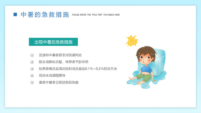 防暑降温预防中暑班会PPT模板。内容包括何为中暑、中暑的急救措施、防暑降温知识、生活小贴士。