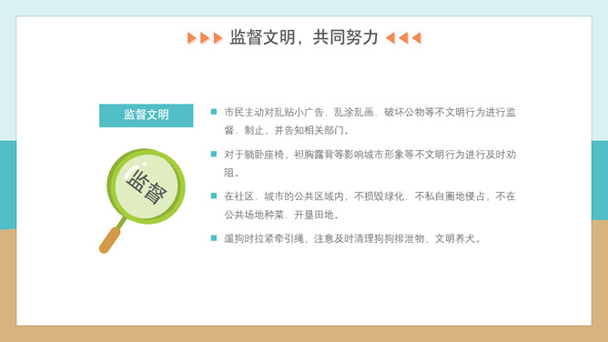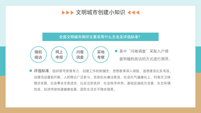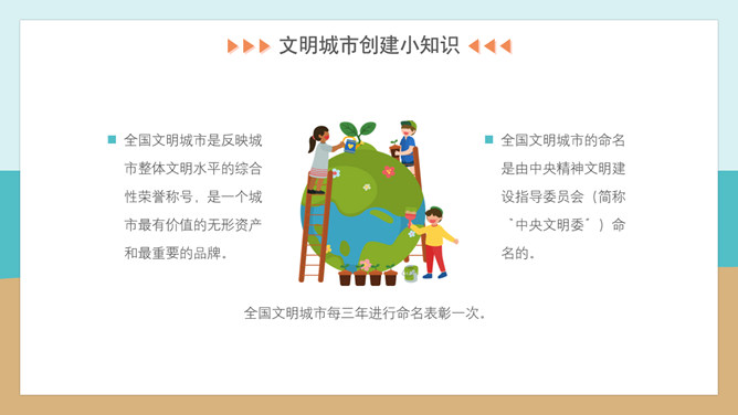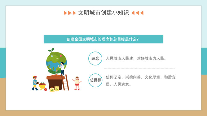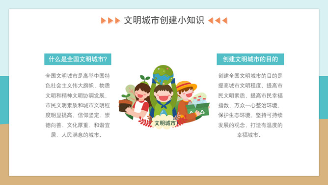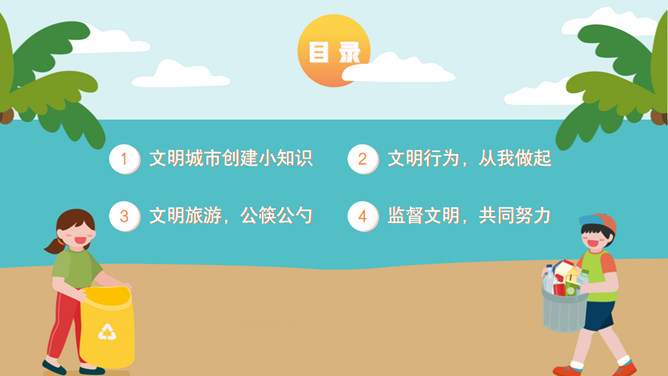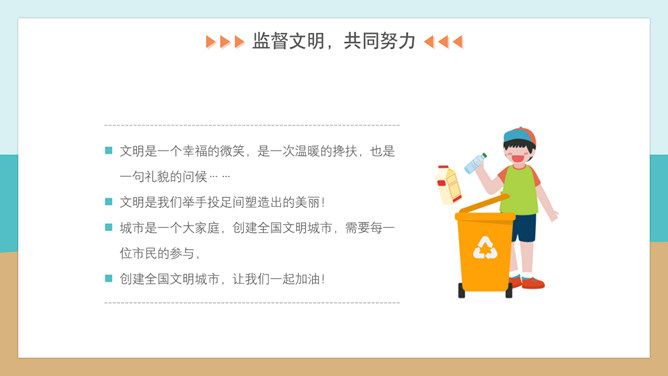 文明礼仪创建文明城市班会PPT模板。内容包括文明城市创建小知识、文明行为从我做起、文明旅游公筷公勺、监督文明共同努力。