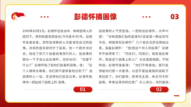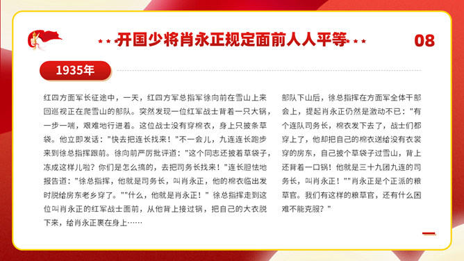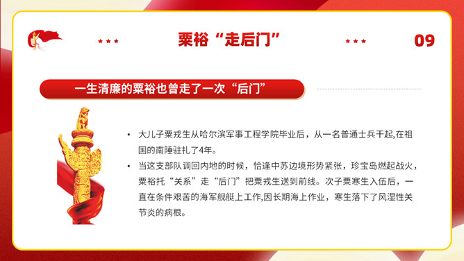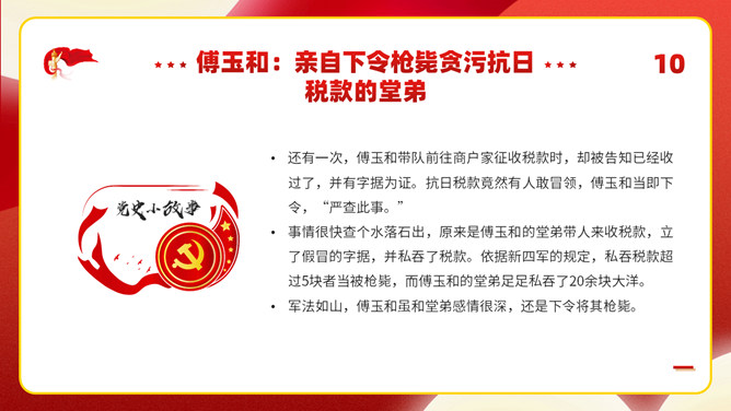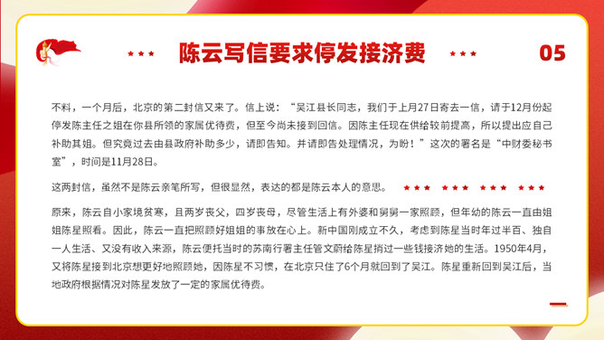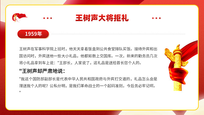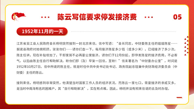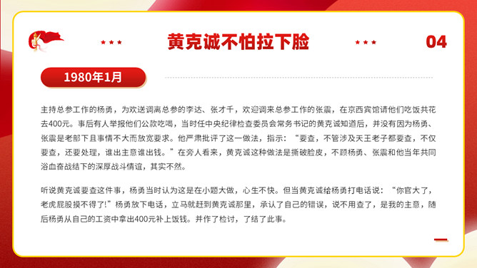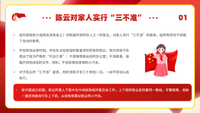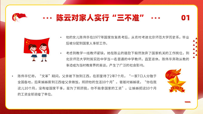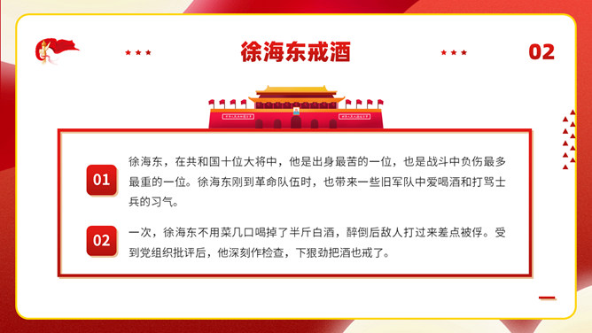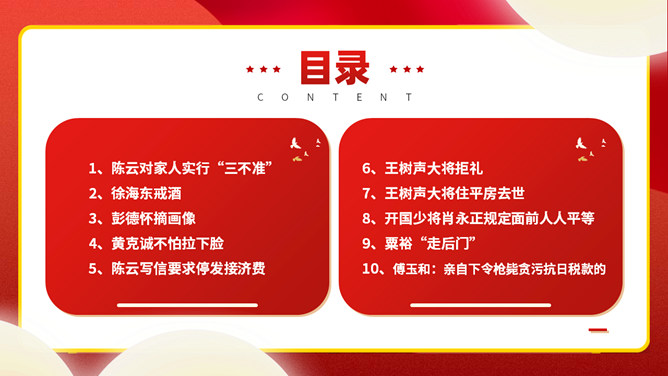 党史小故事班会PPT模板。包括陈云对家人实行“三不准”、徐海东戒酒、彭德怀摘画像、黄克诚不怕拉下脸、陈云写信要求停发接济费等内容。