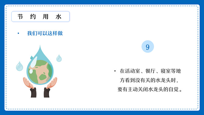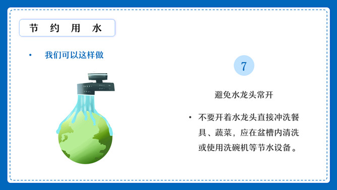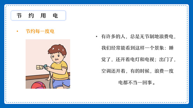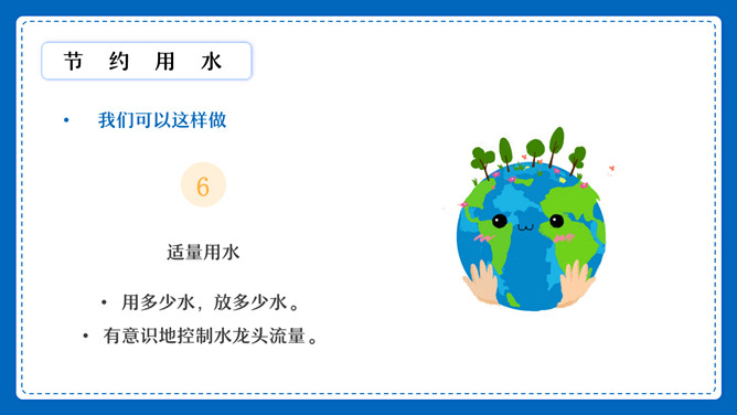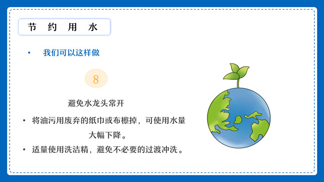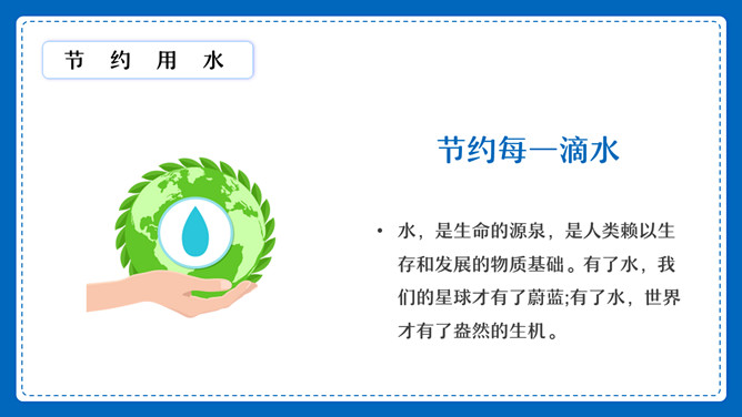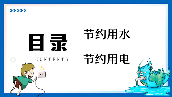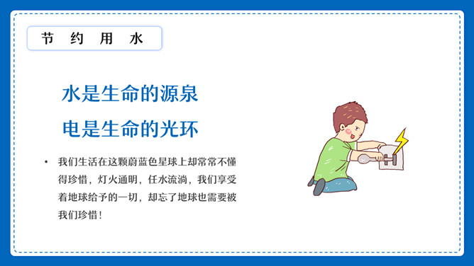 节约用水用电班会PPT模板。水是生命的源,电是生命的光环。我们生活在这颗蔚蓝色星球上却常常不懂得珍惜,灯火通明,任水流淌,我们享受着地球给予的一切,却忘了地球也需要被我们珍惜!