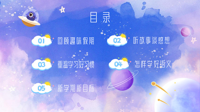 小学语文开学第一课PPT模板。内容包括回顾趣味假期、听故事谈感想、重温学习好习惯、怎样学好语文、新学期新目标。