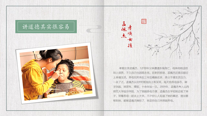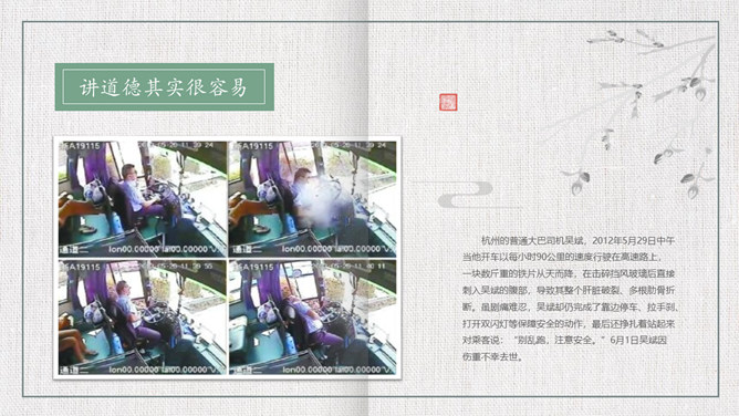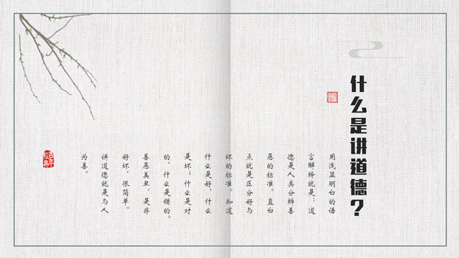 道德讲堂主题班会PPT模板。什么是讲道德?用浅显明白的语言解释就是:道德是人类分辨善恶的标准。直白点就是区分好与坏的标准。知道什么是好,什么是坏;什么是对的,什么是错的。善恶美丑,是非好坏,很简单。讲道德就是与人为善。