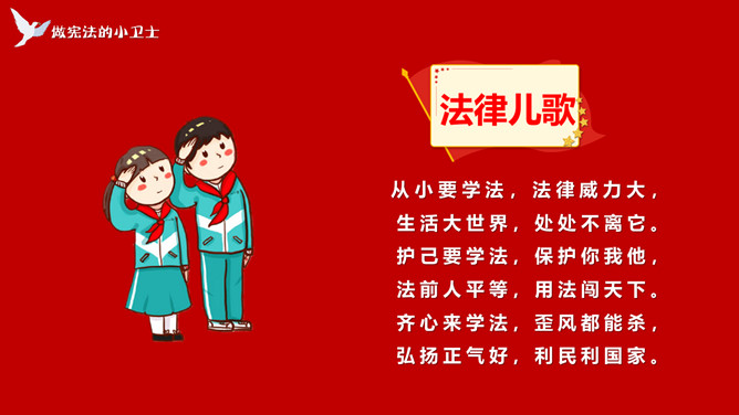 学宪法讲宪法班会课件PPT模板。内容包括了解宪法、宪法和我们的关系、做宪法的小卫士、知识问答。