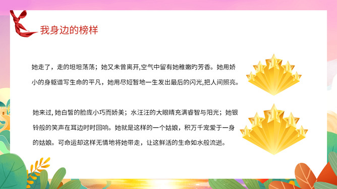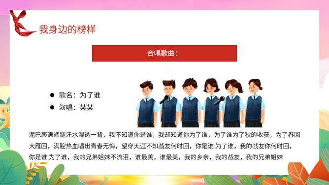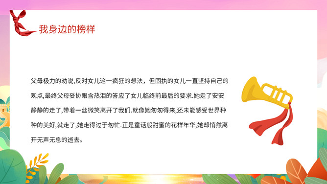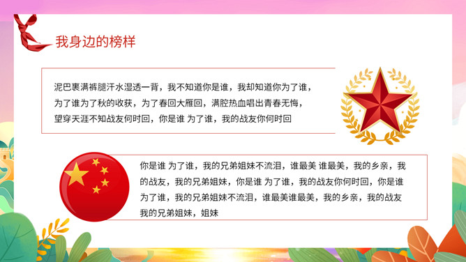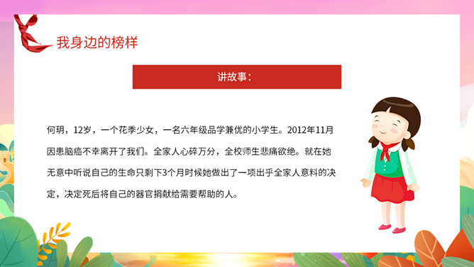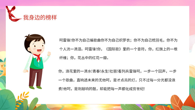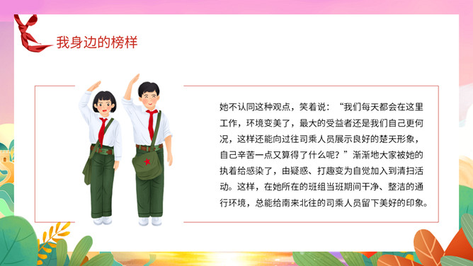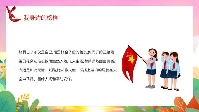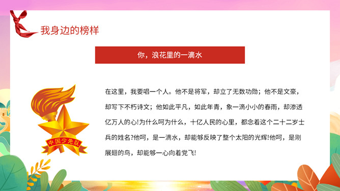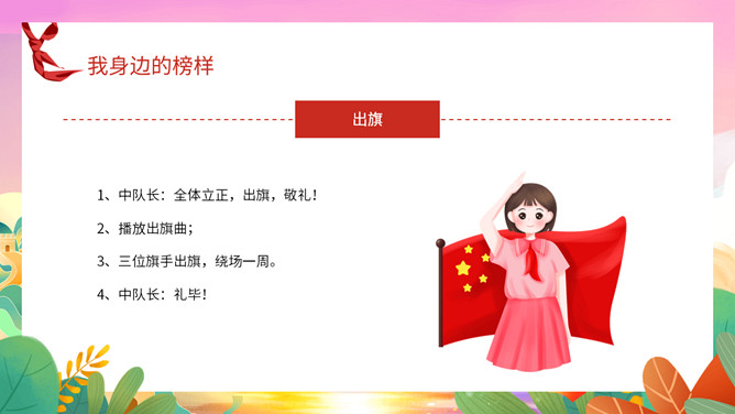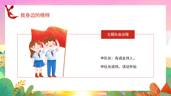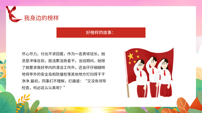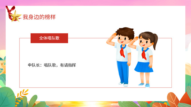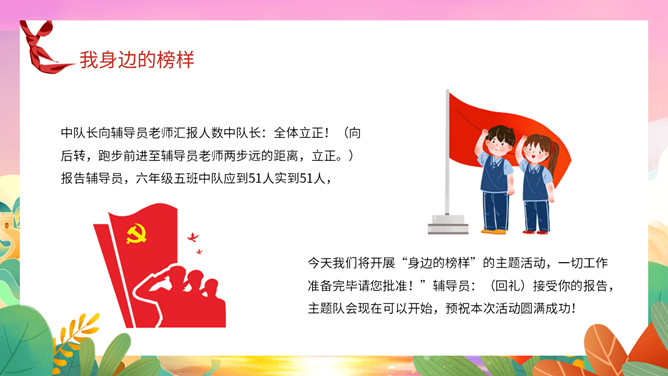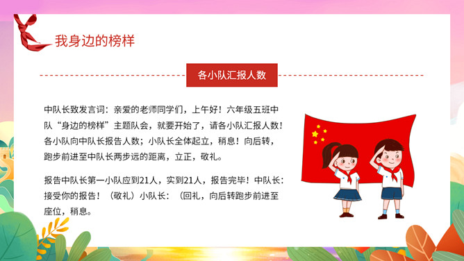 我身边的榜样班会课件PPT模板。中队长致发言词:亲爱的老师同学们,上午好!六年级五班中队“身边的榜样”主题队会,就要开始了,请各小队汇报人数!各小队向中队长报告人数;小队长全体起立,稍息!向后转,跑步前进至中队长两步远的距离,立正,敬礼。