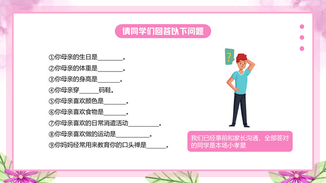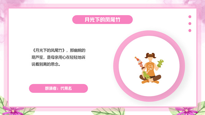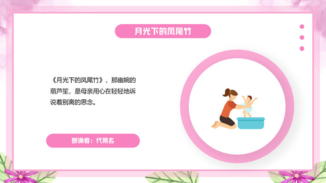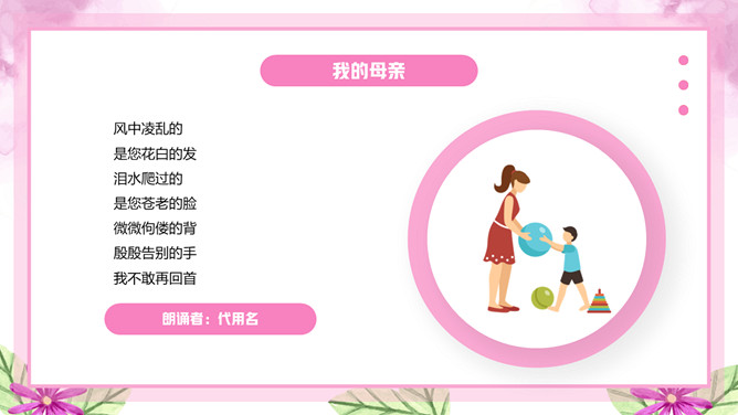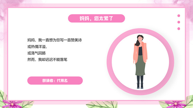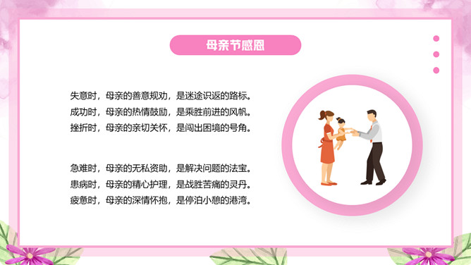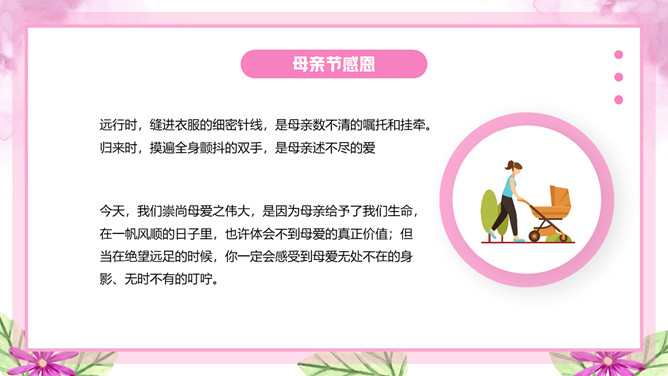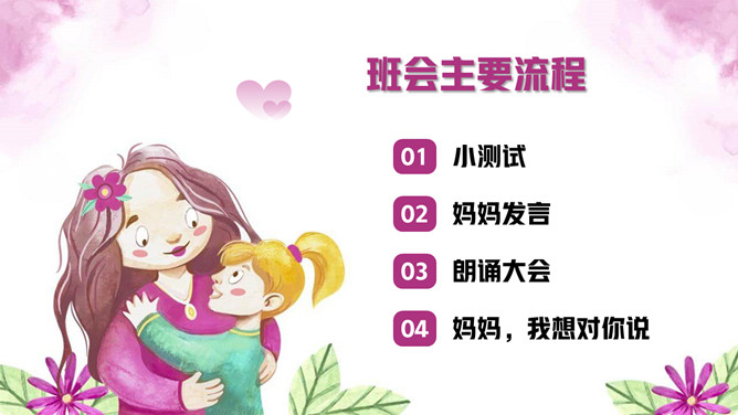 感恩母亲节主题朗诵班会PPT模板。我们崇尚母爱之伟大,是因为母亲给予了我们生命,在一帆风顺的日子里,也许体会不到母爱的真正价值;但当在绝望远足的时候,你一定会感受到母爱无处不在的身影、无时不有的叮咛。