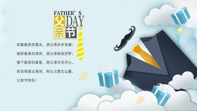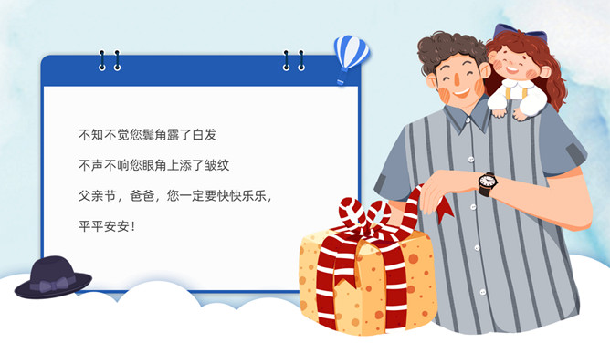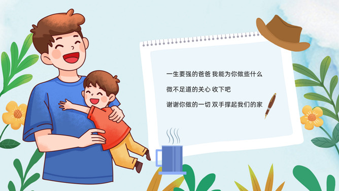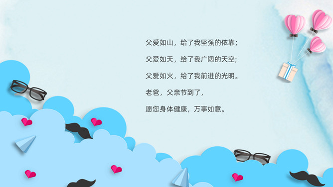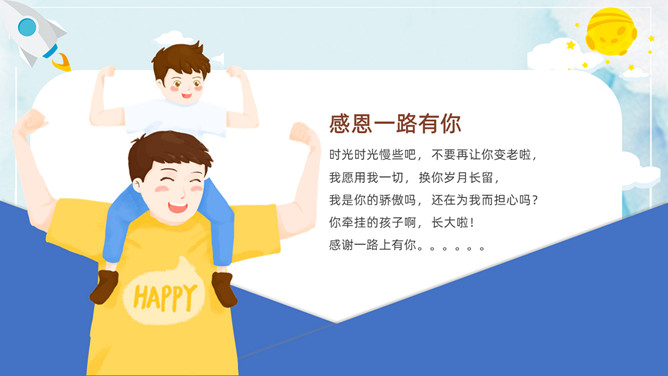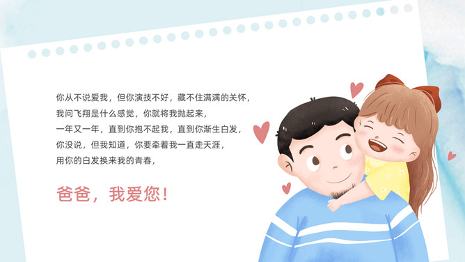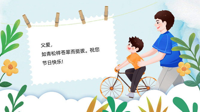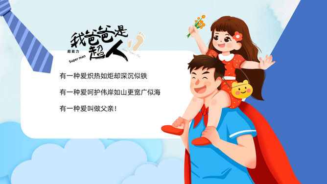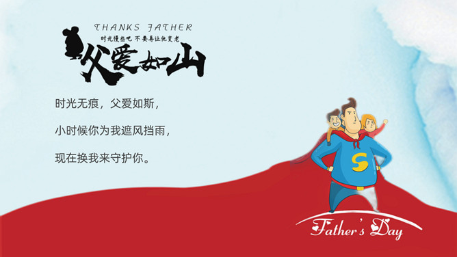父爱如山感恩父亲节PPT模板。承蒙时光不弃,感恩一切给予,感谢你陪我长大,给了我你的全世界。岁月将你的青春燃烧,但你的关怀和勉励却伴着我信步雨人生。时光无痕,父爱如斯,小时候你为我遮风挡雨,现在换我来守护你。