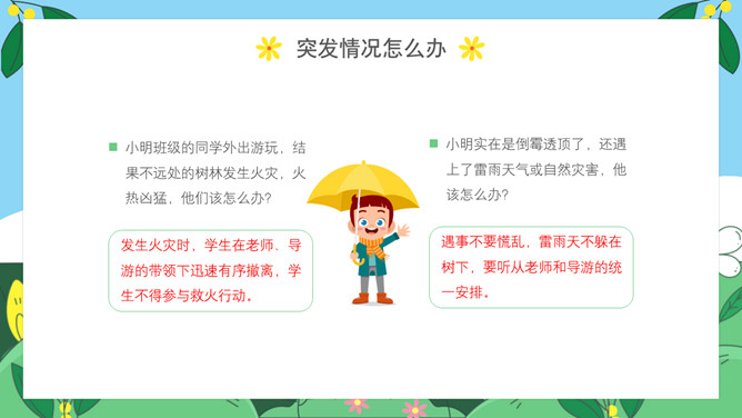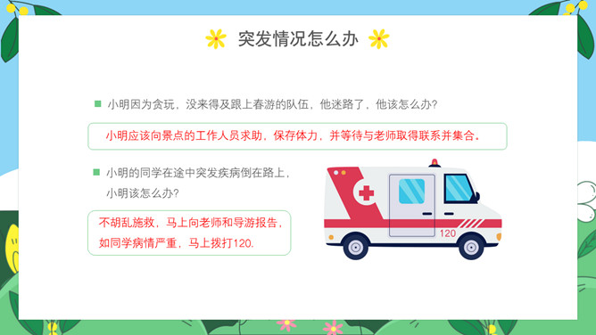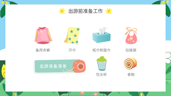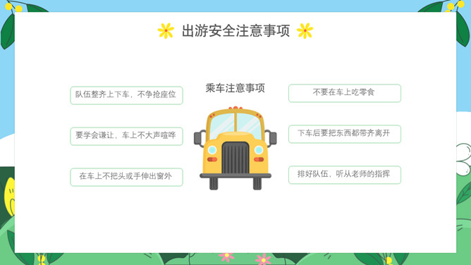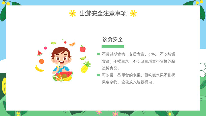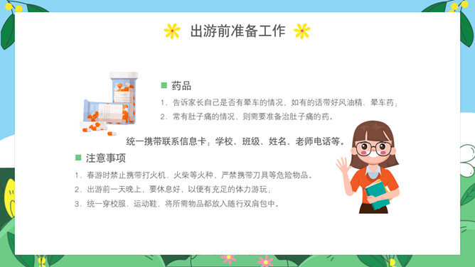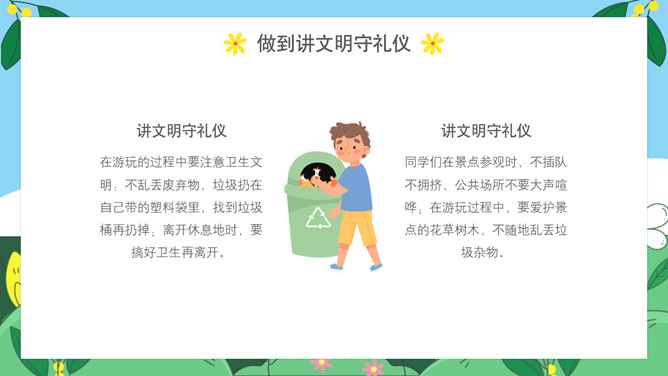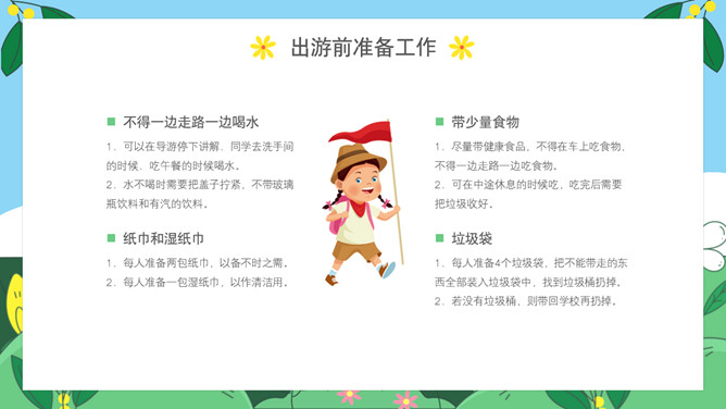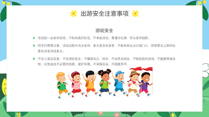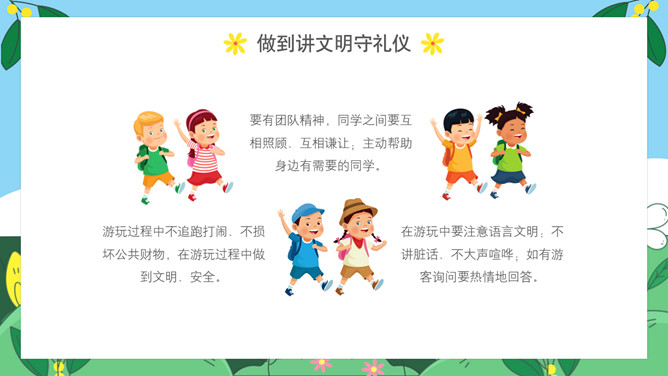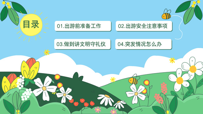 小学生春游安全教育PPT模板。内容包括出游前准备工作、出游安全注意事项、做到讲文明守礼仪、突发情况怎么办。