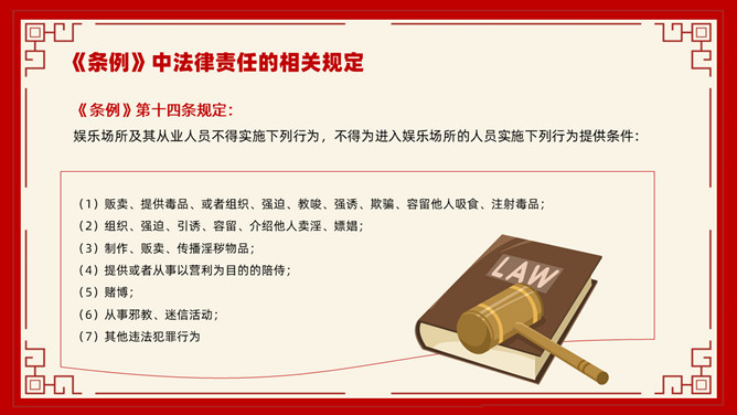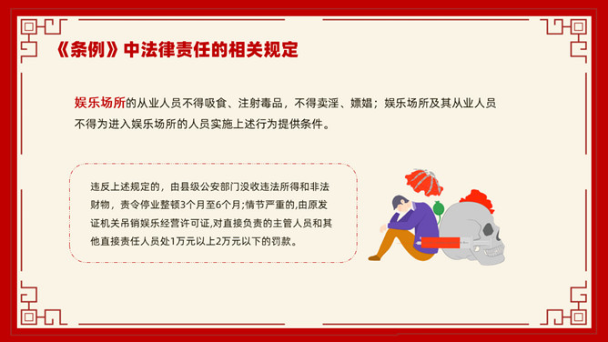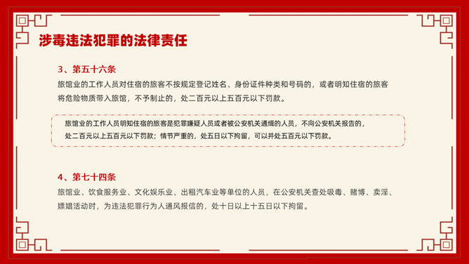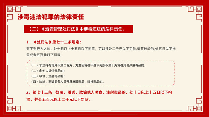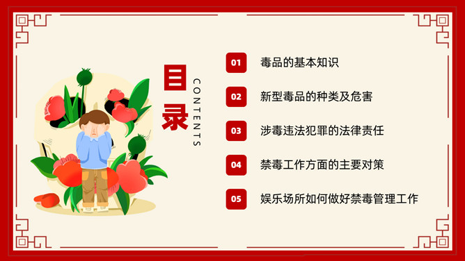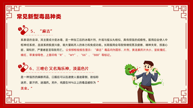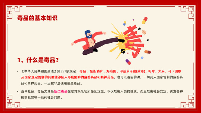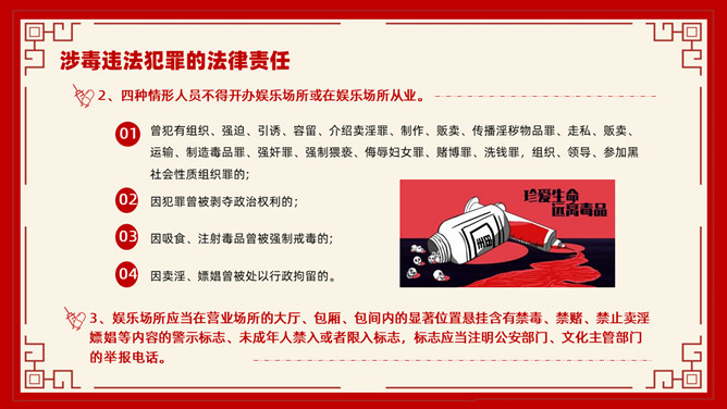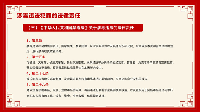 禁毒教育班会课件PPT模板。内容包括毒品的基本知识、新型毒品的种类及危害、涉毒违法犯罪的法律责任、禁毒工作方面的主要对策、娱乐场所如何做好禁毒管理工作。
