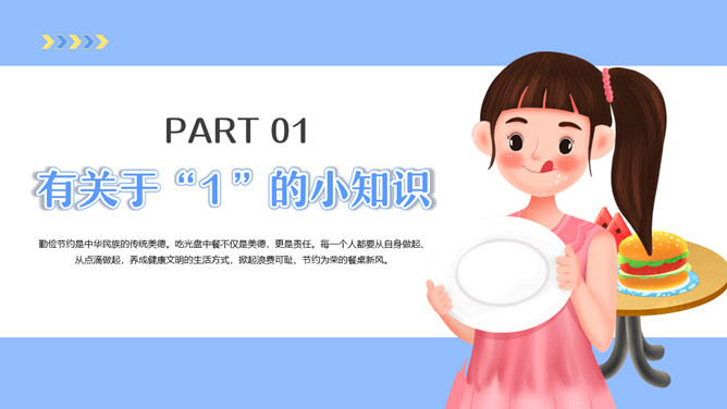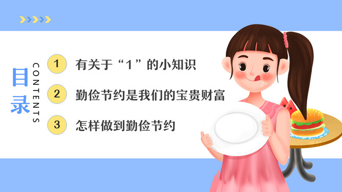 勤俭节约从我做起班会PPT模板。内容包括有关于“1”的小知识、勤俭节约是我们的宝贵财富、怎样做到勤俭节约。
