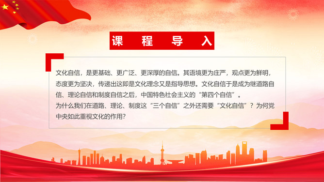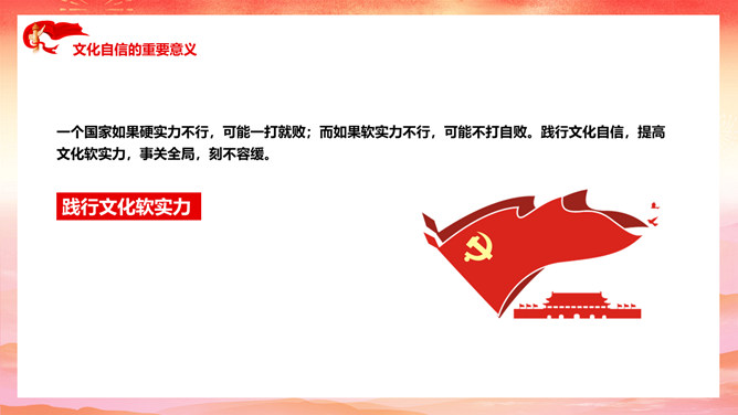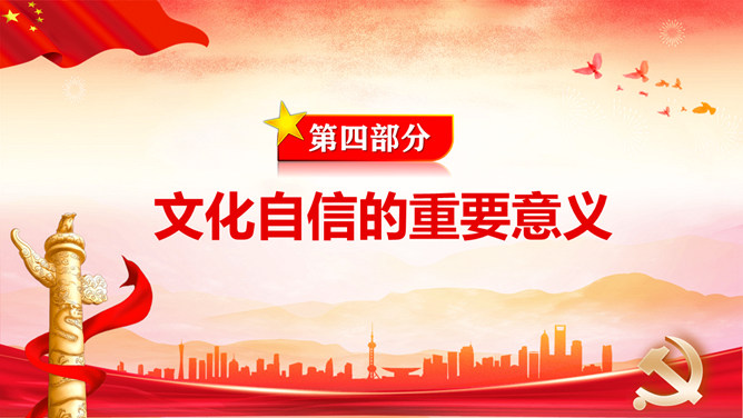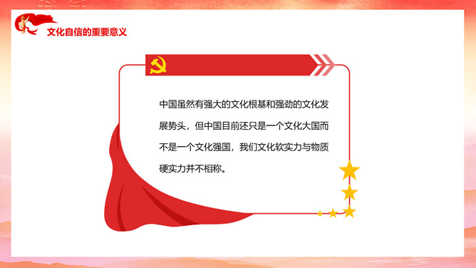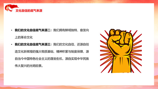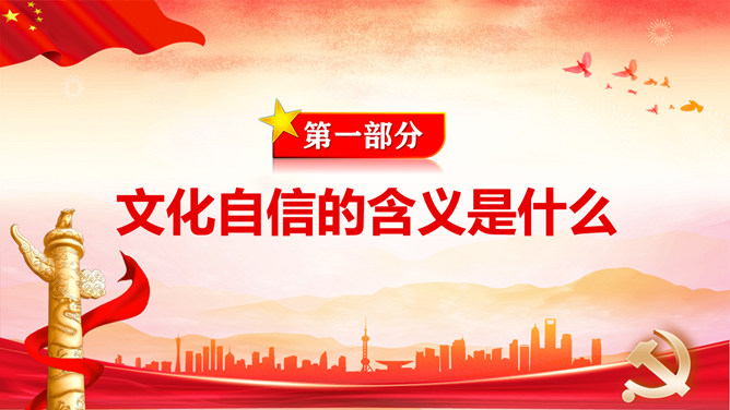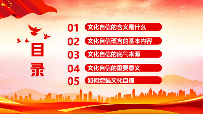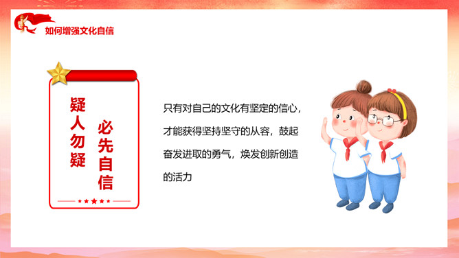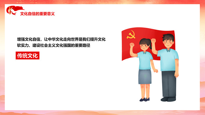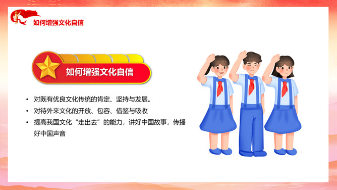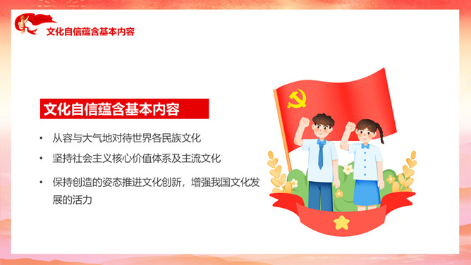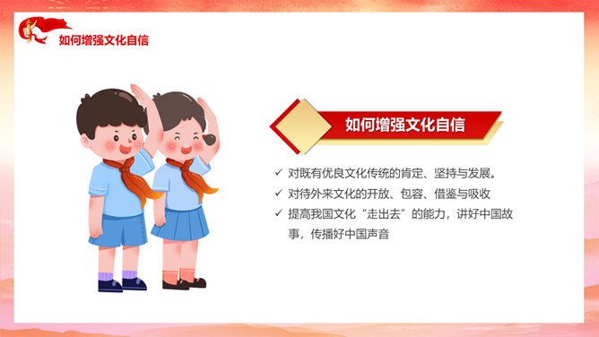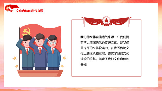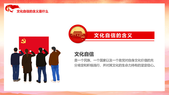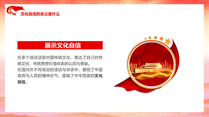 增强文化自信班会PPT模板。内容包括文化自信的含义是什么、文化自信蕴含的基本内容、底气来源、重要意义和如何增强文化自信。