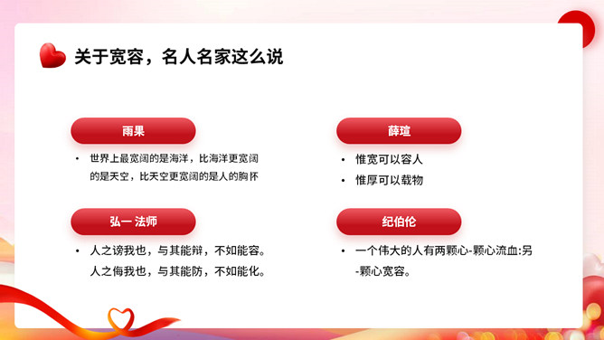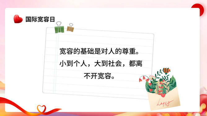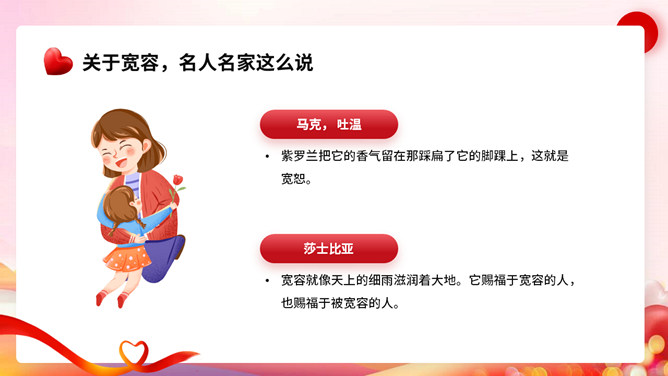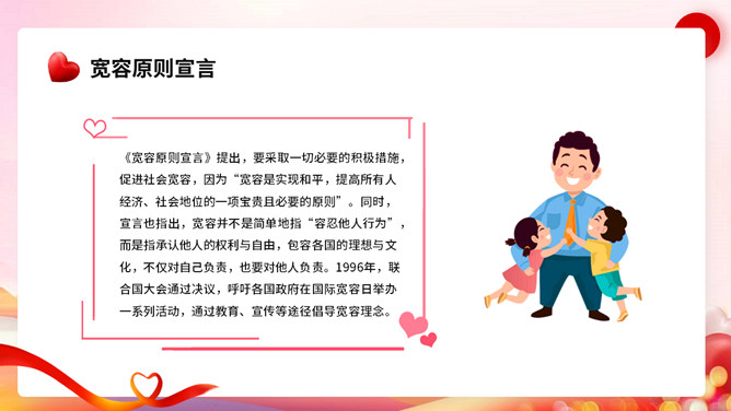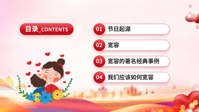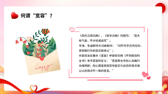 宽容别人快乐自己班会PPT模板。内容包括节日起源、宽容的著名经典事例、我们应该如何宽容。