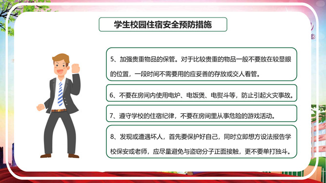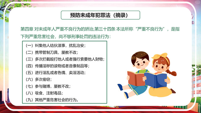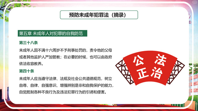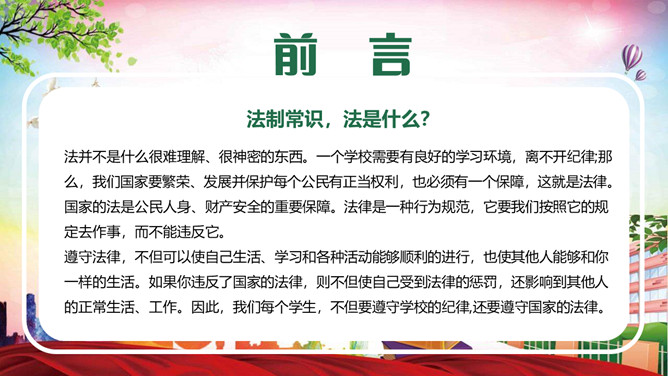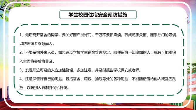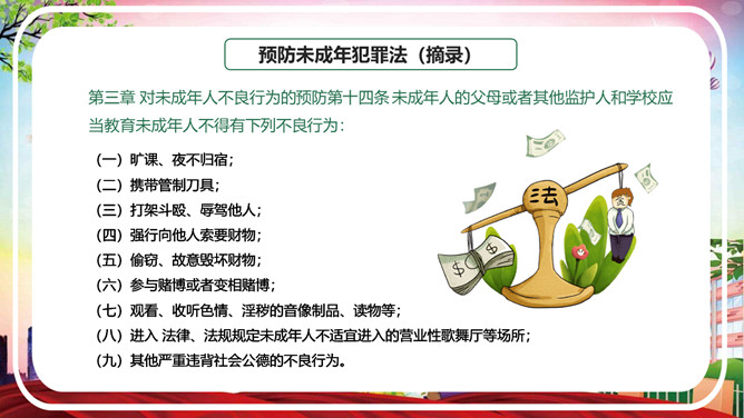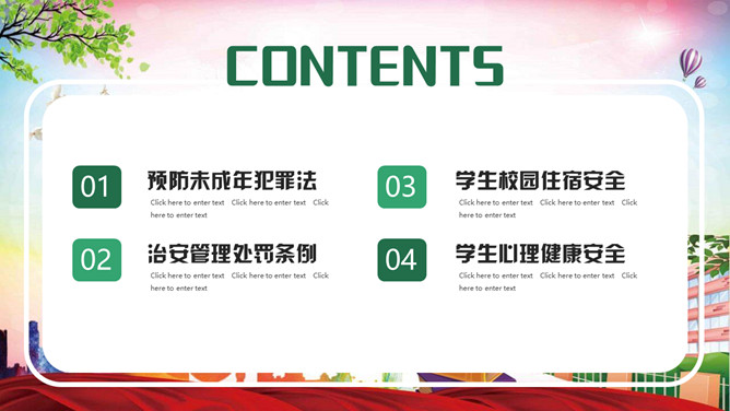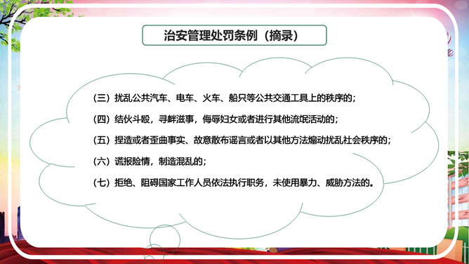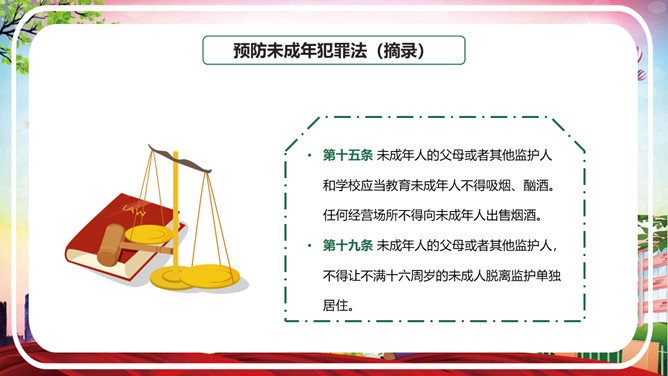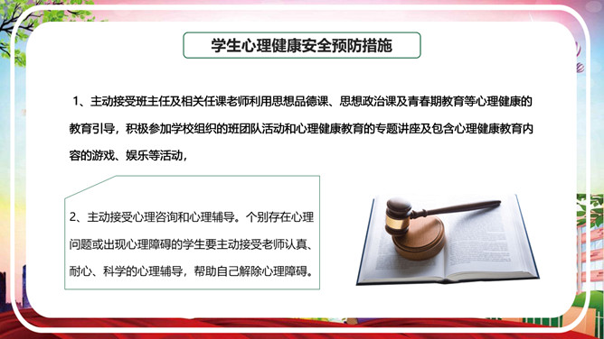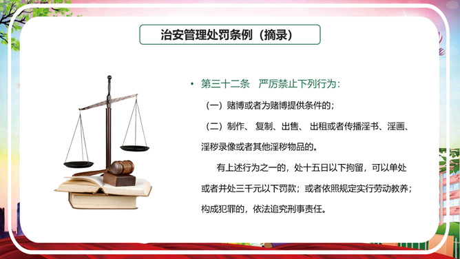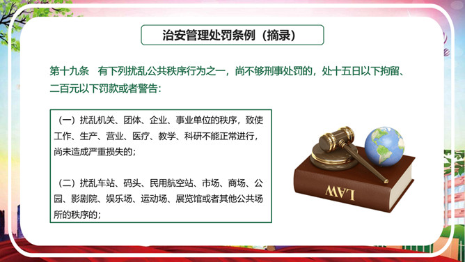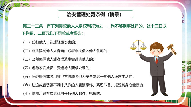 校园法制教育宣传PPT模板。内容包括预防未成年犯罪法、学生校园住宿安全、治安管理处罚条例、学生心理健康安全。