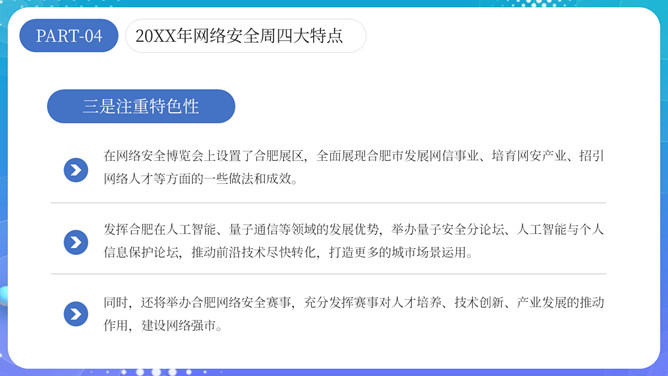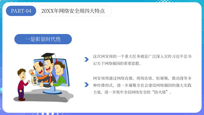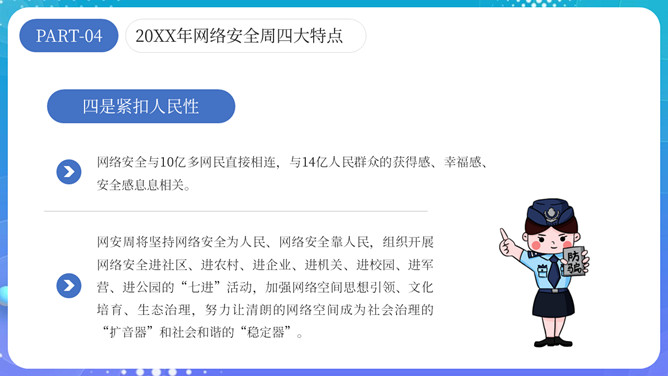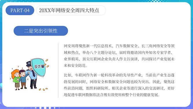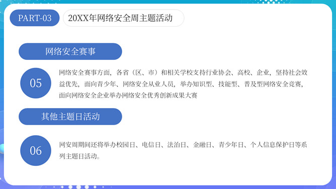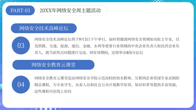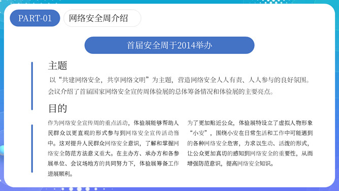 网络安全宣传周主题PPT模板。内容包括网络安全周介绍、网络安全周主题活动和四大特点。