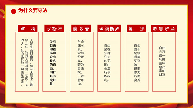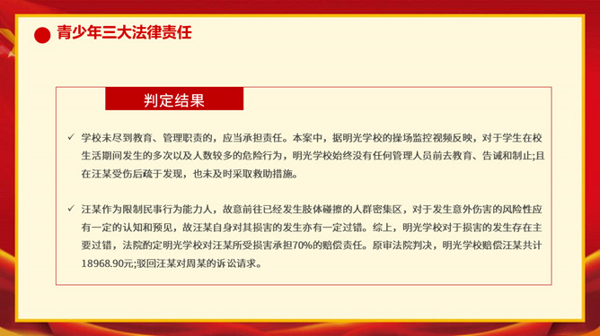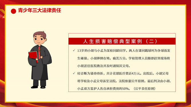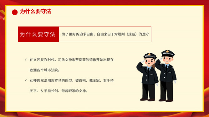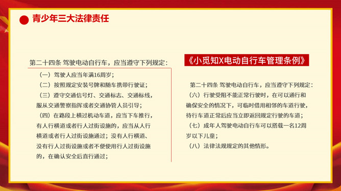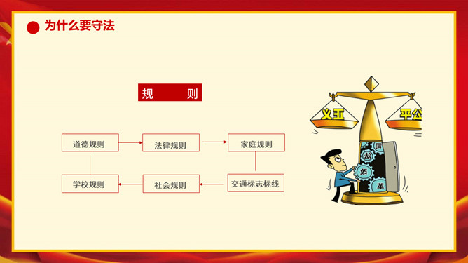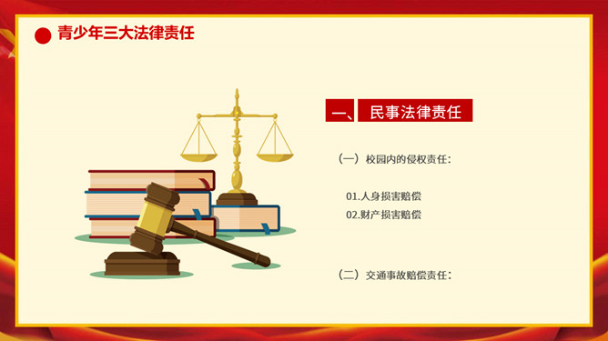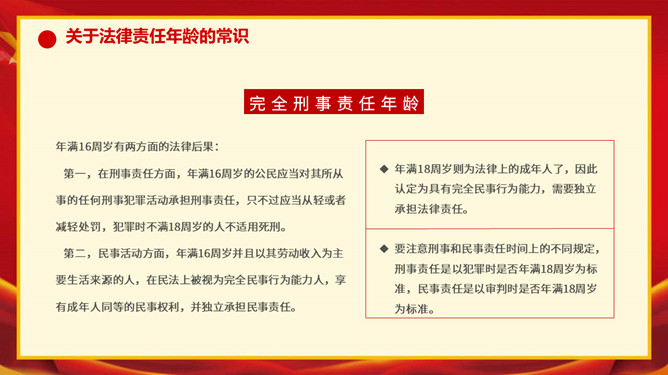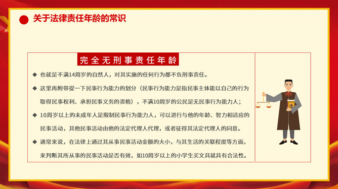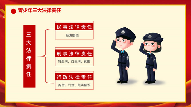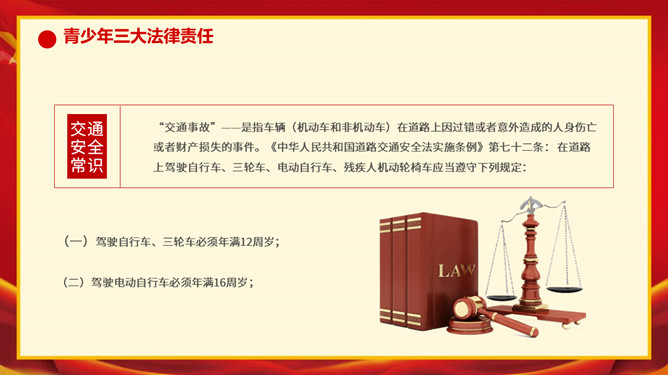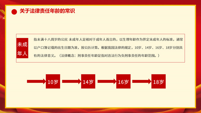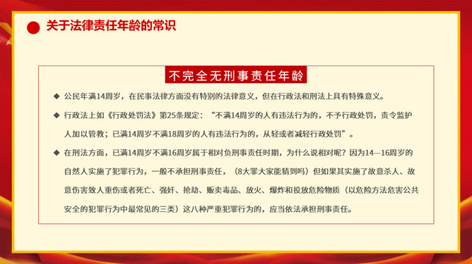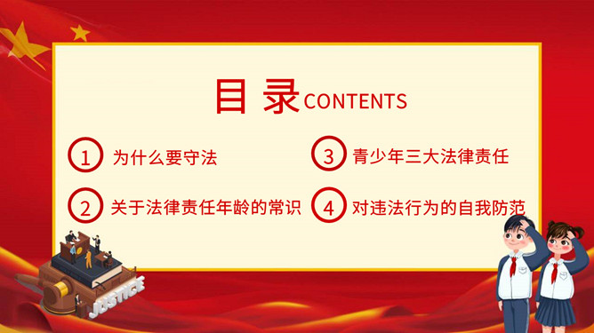 法律意识法制教育班会PPT模板。内容包括为什么要守法、关于法律责任年龄的常识、青少年三大法律责任、对违法行为的自我防范。