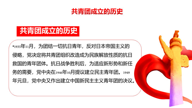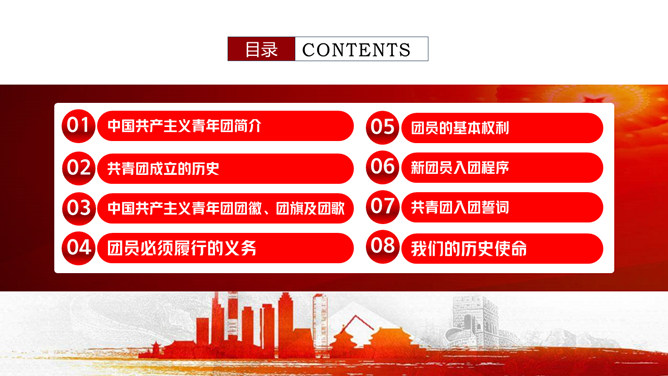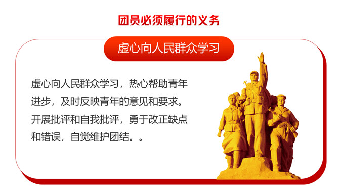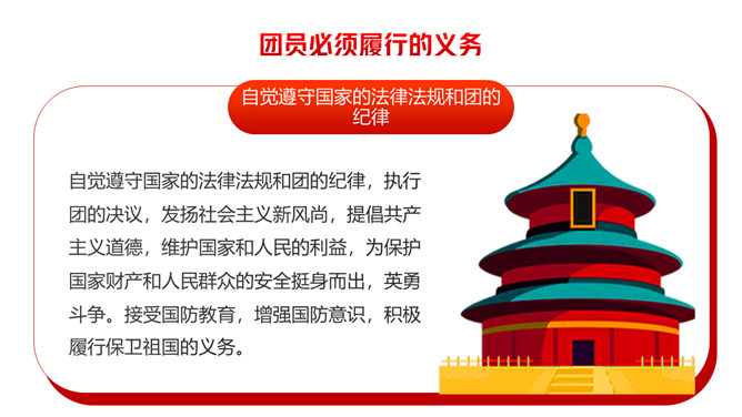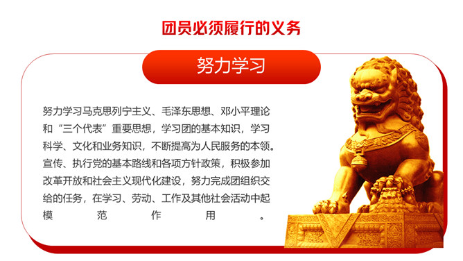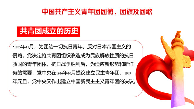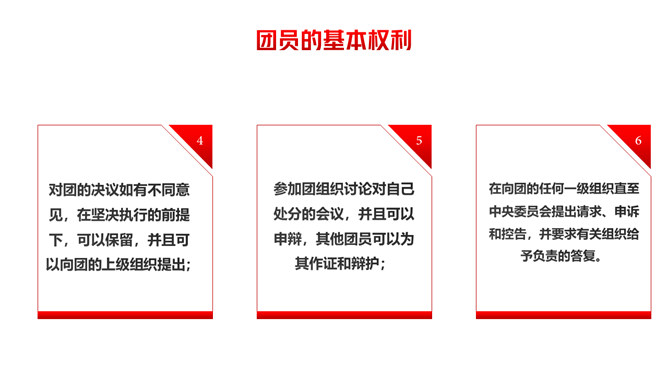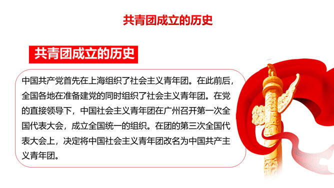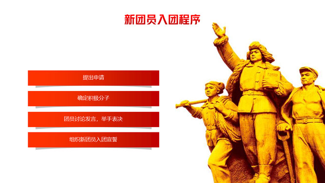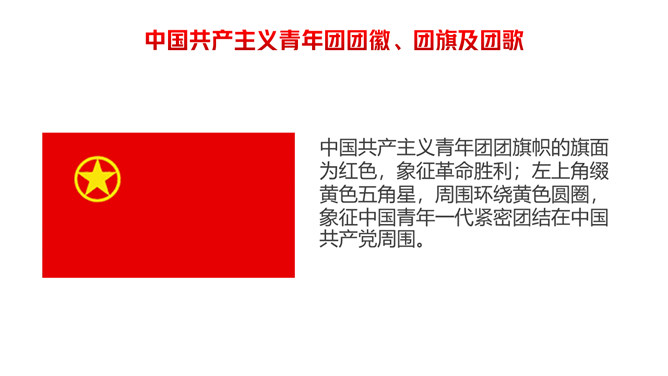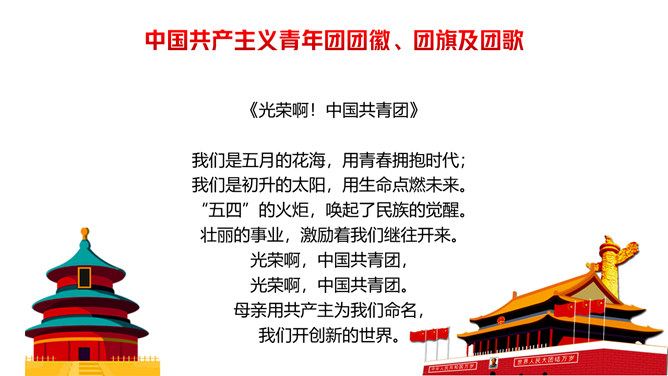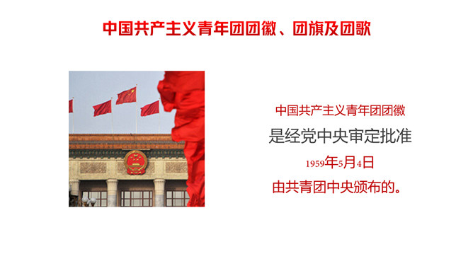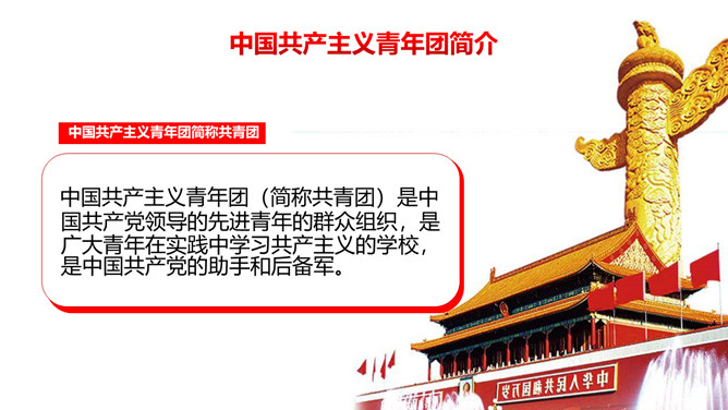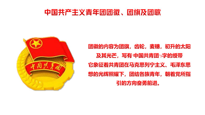 五四共青团入团宣传PPT模板。内容包括中国共产主义青年团简介、共青团成立的历史、团徽团旗及团歌、团员必须履行的义务、团员的基本权利等内容。
