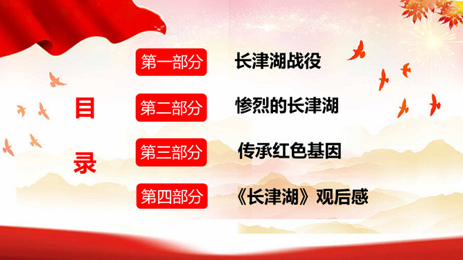 爱国主义教育血战长津湖PPT模板。内容包括长津湖战役、惨烈的长津湖、传承红色基因、《长津湖》观后感。