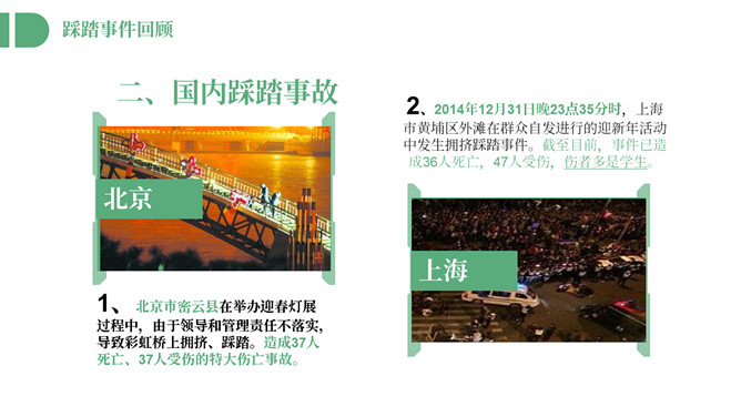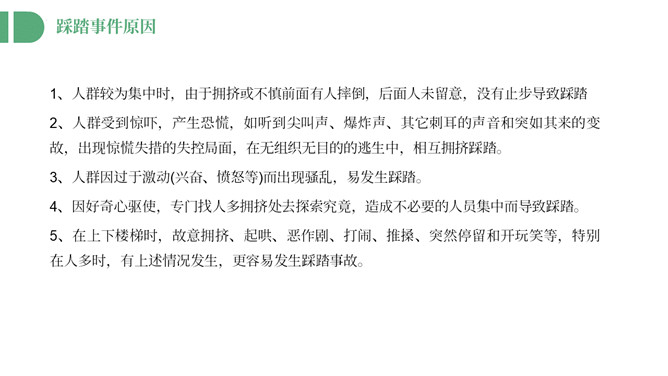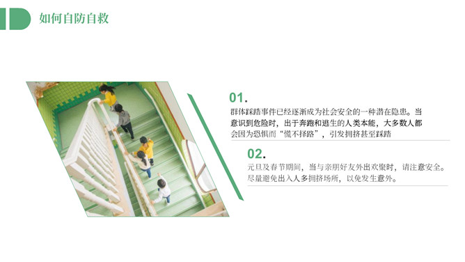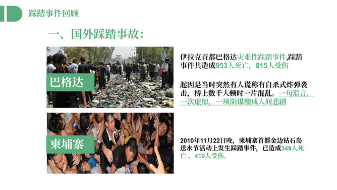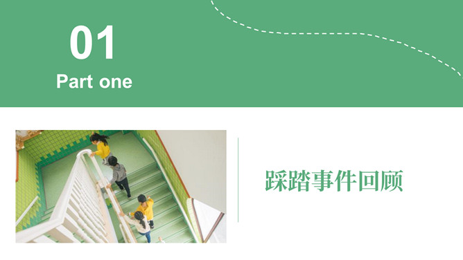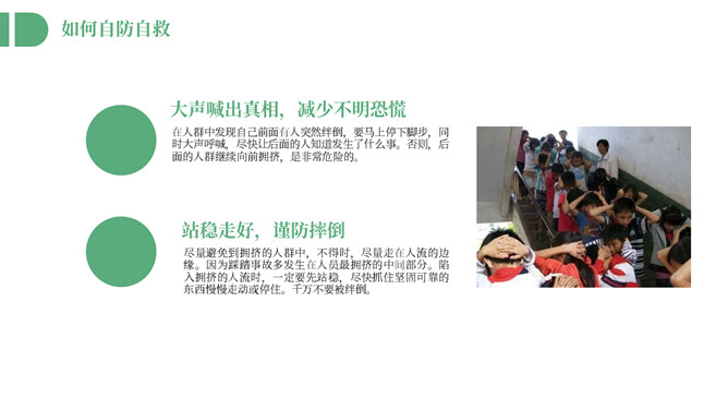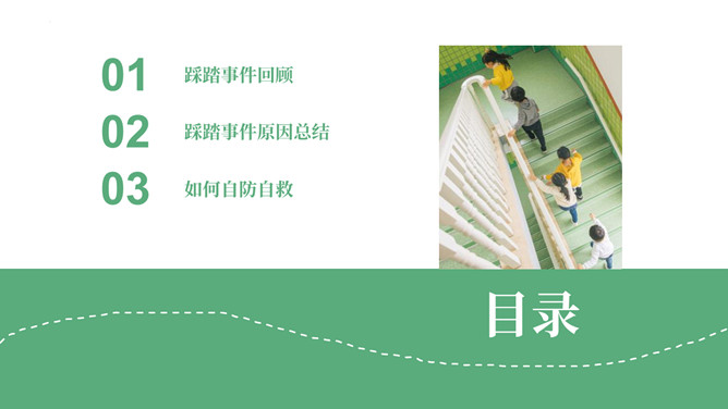 防踩踏安全教育主题班会PPT模板。内容包括踩踏事件回顾、踩踏事件原因总结、如何自防自救。