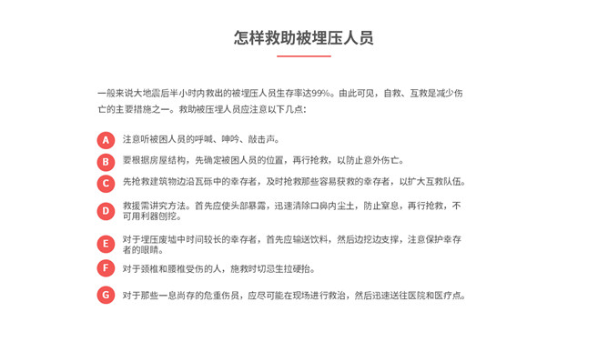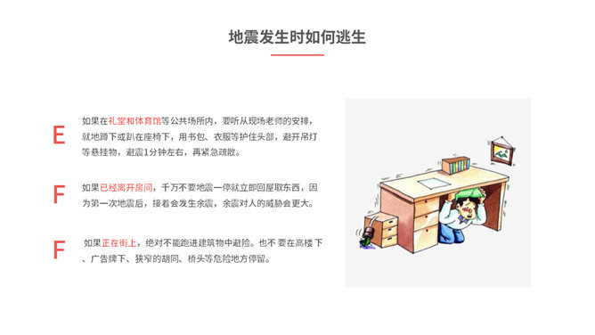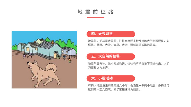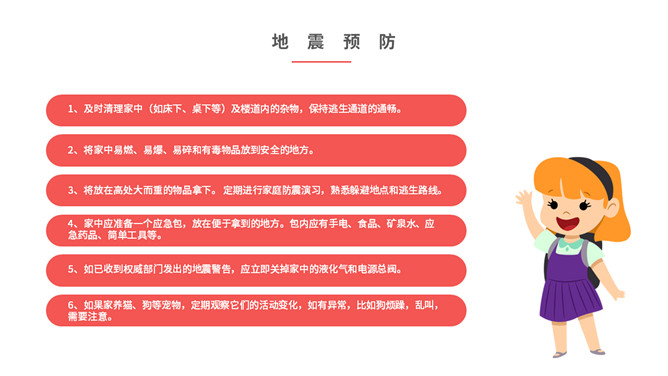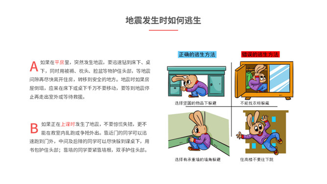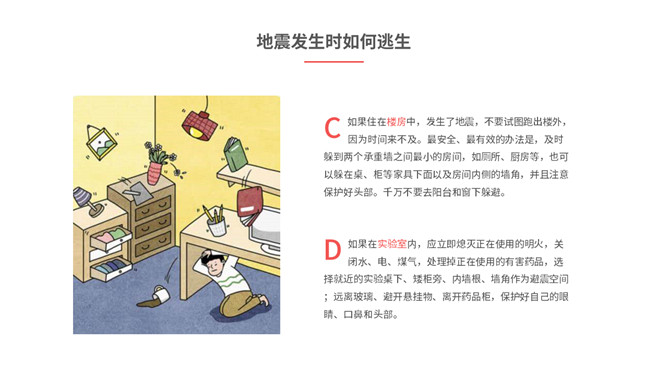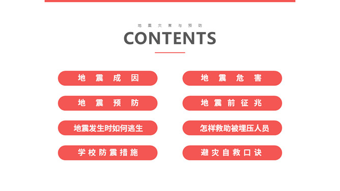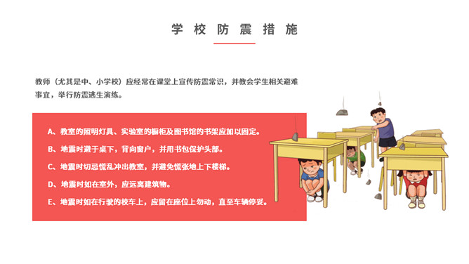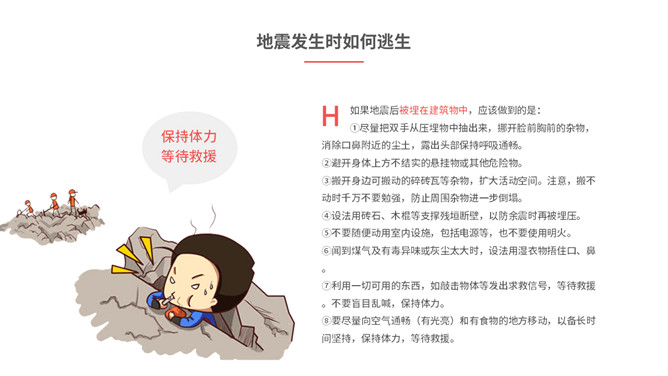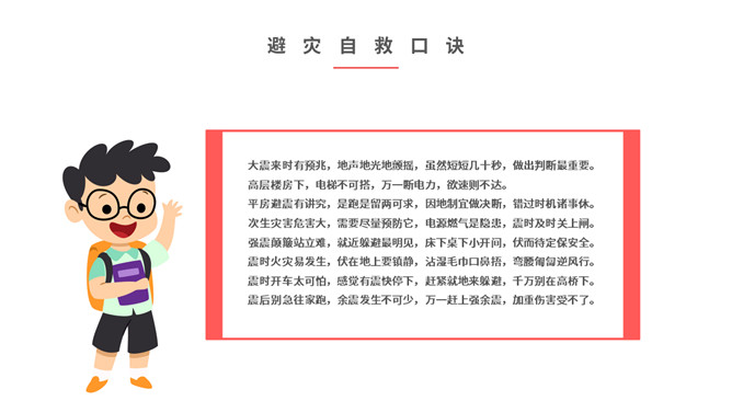 内容包括地震成因、地震危害、地震预防、地震前征兆、地震发生时如何逃生、怎样救助被埋压人员、学校防震措施、避灾自救口诀。