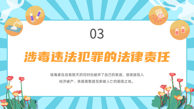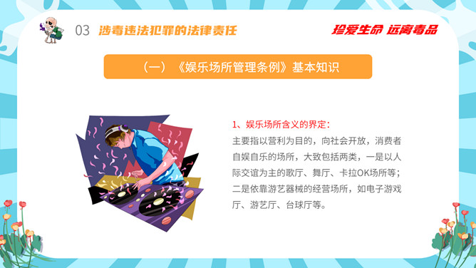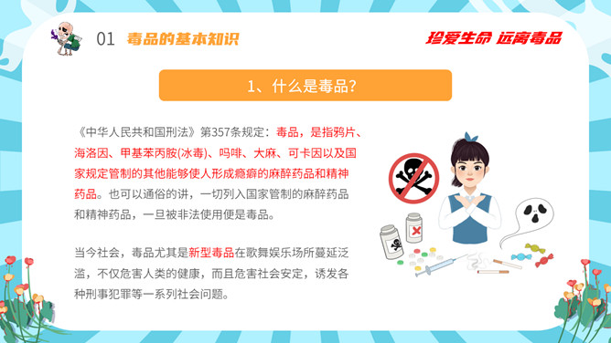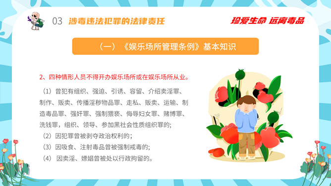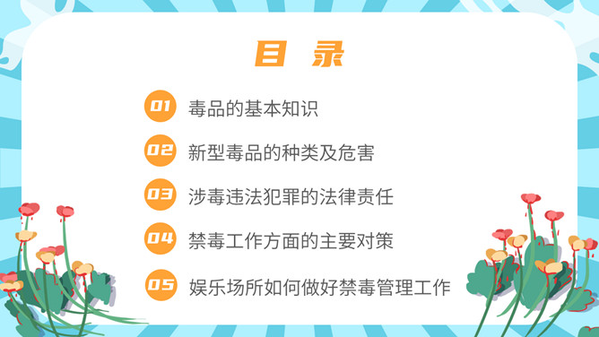拒绝毒品禁毒教育班会PPT模板。内容包括毒品的基本知识、新型毒品的种类及危害、涉毒违法犯罪的法律责任、禁毒工作方面的主要对策、娱乐场所如何做好禁毒管理工作。