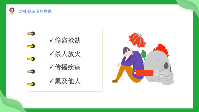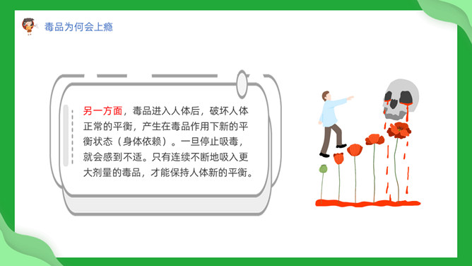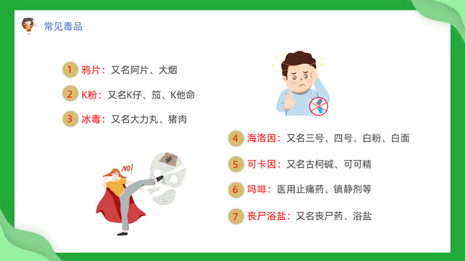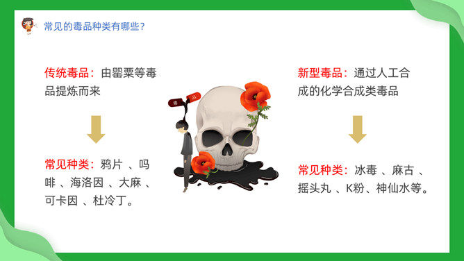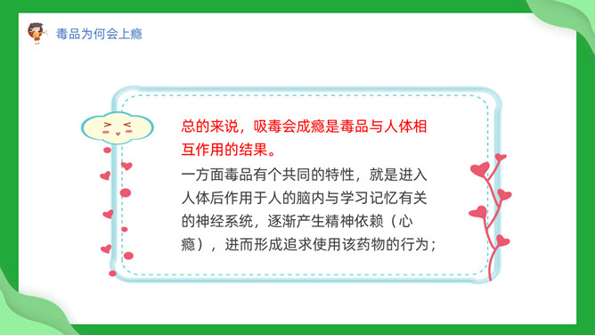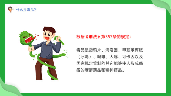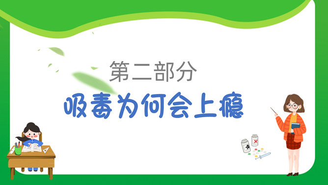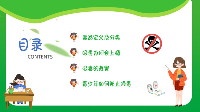 中小学禁毒教育班会PPT模板。内容包括毒品定义及分类、吸毒为何会上瘾、吸毒的危害、青少年如何防止吸毒。