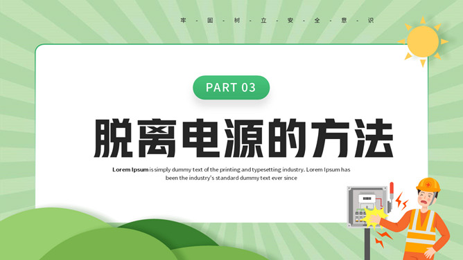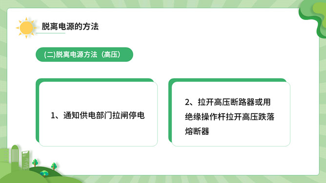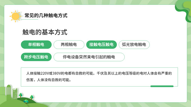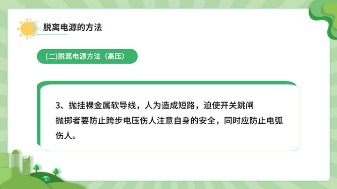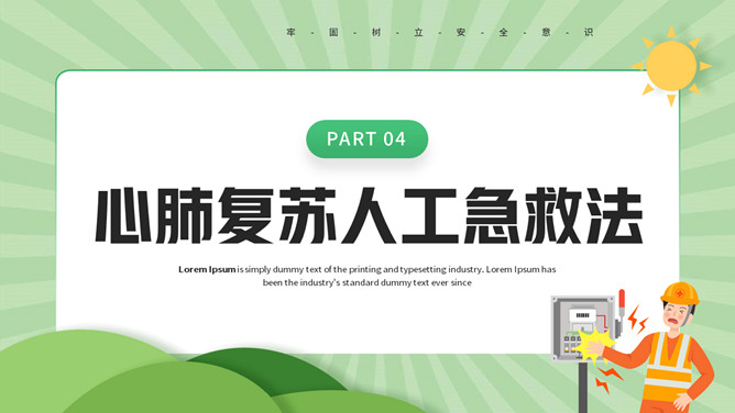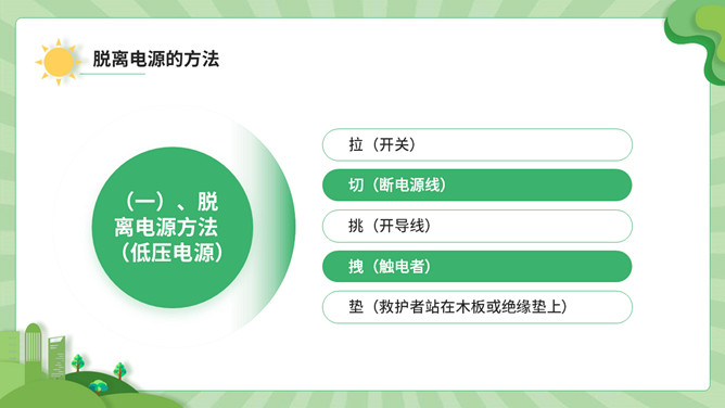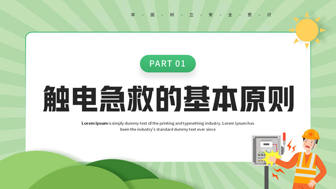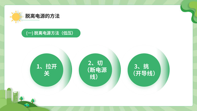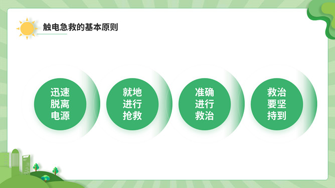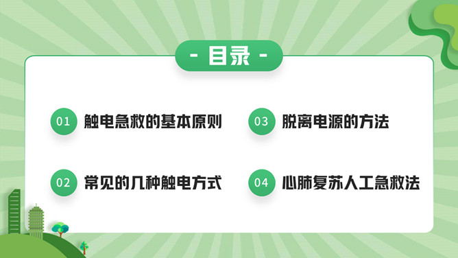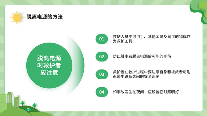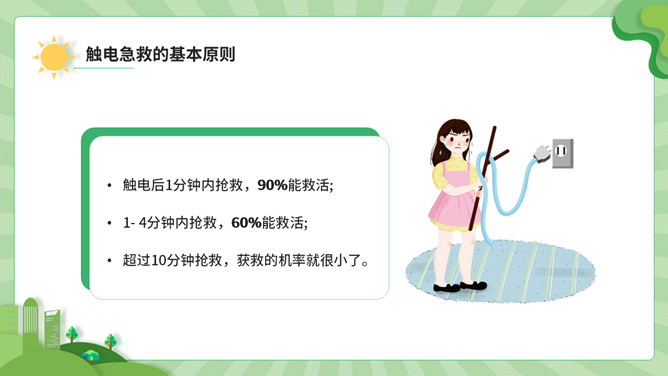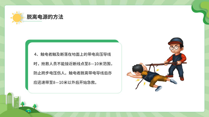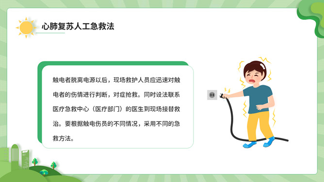 防触电急救知识PPT模板。内容包括触电急救的基本原则、常见的几种触电方式、脱离电源的方法、心肺复苏人工急救法。
