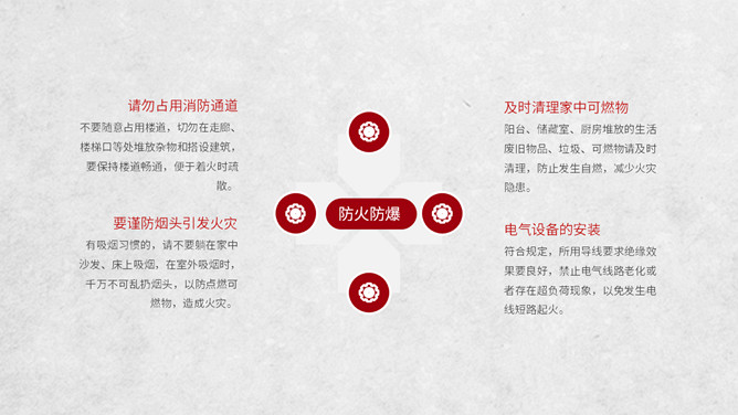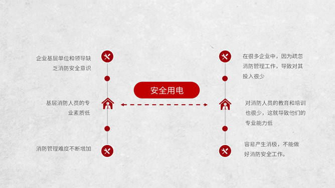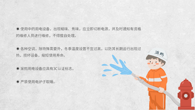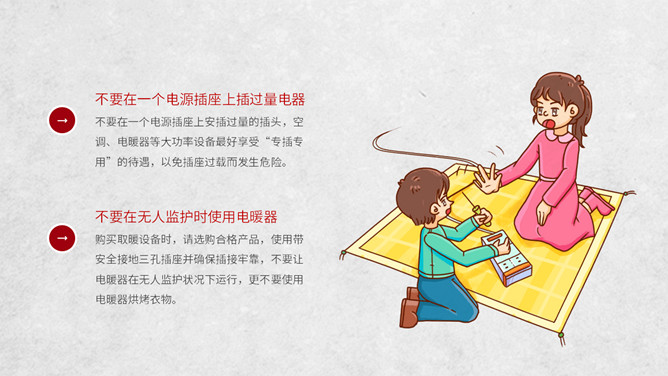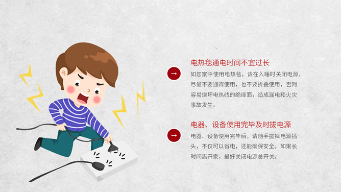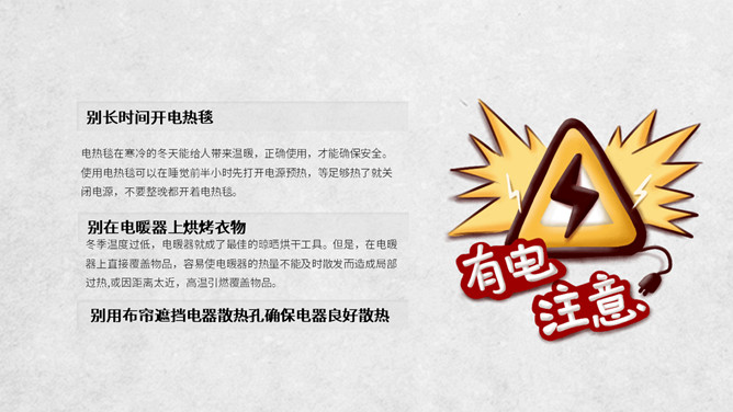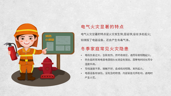 冬季用电防火知识班会PPT模板。电气火灾显著的特点是火灾发生快;蔓延快;容易多处起火;如烧毁了电器设备,还会产生有毒气体。